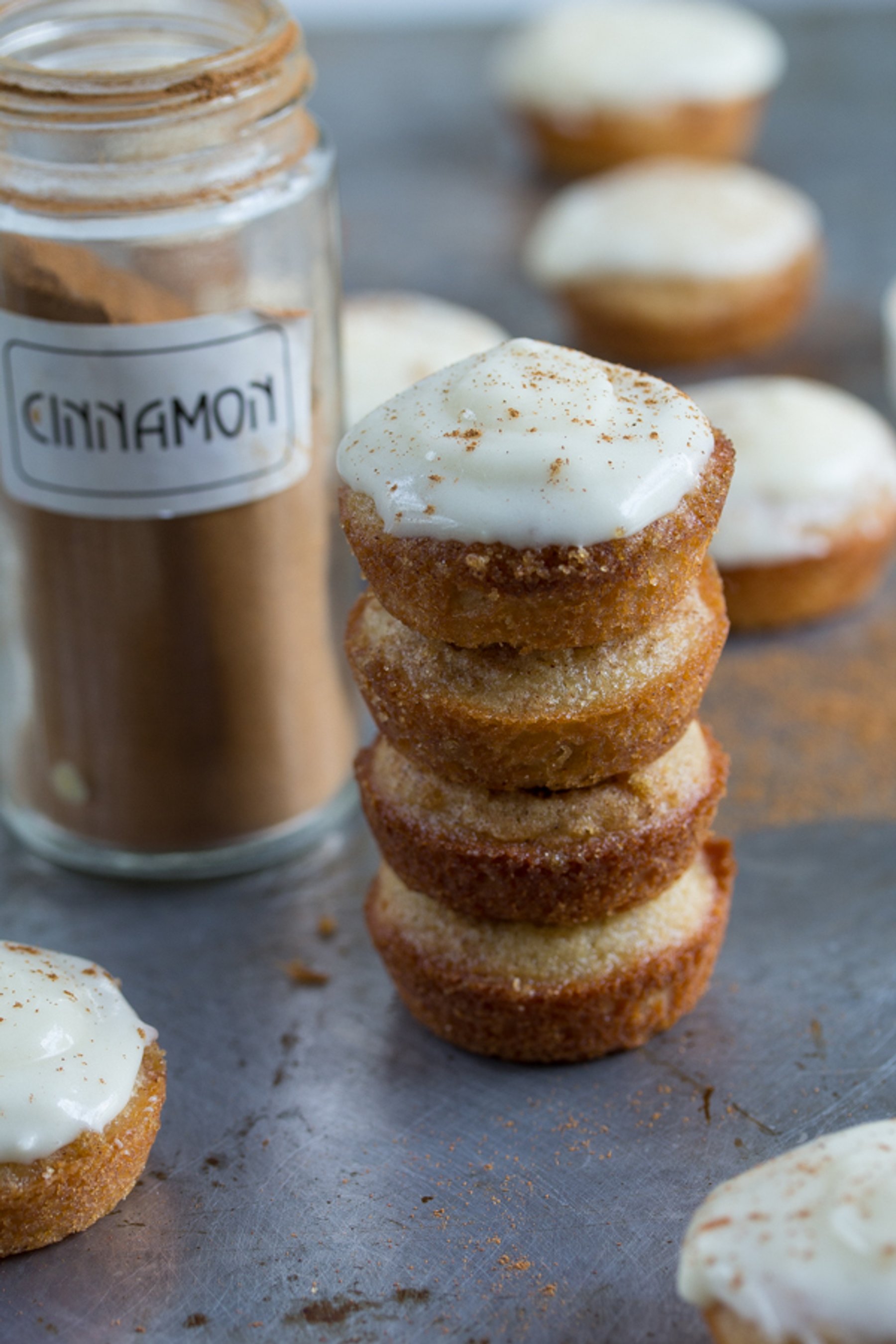 Mini-sized blondies are sprinkled with cinnamon sugar and smothered with cream cheese frosting. A one-bite dose of cinnamon roll flavor!