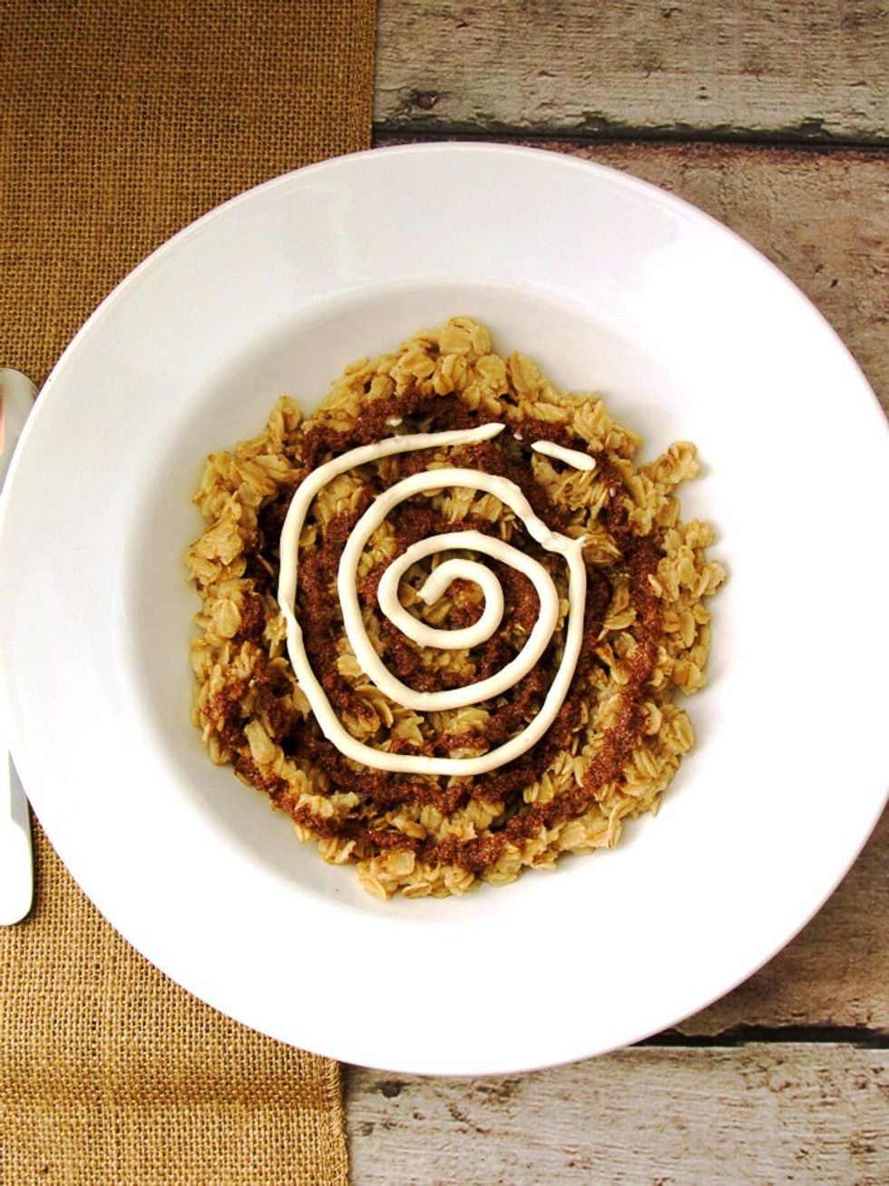 Cinnamon Roll Oatmeal Kimberly VargoOctober 09, 2016 17 Swirls of cinnamon, brown sugar, and vanilla cream cheese top soft, warm oatmeal in this inviting, protein filled breakfast dish. One bite of Cinnamon Roll Oatmeal and you’ll be in love.http://www.berlyskitchen.com/cinnamon-roll-oatmeal/See the full directions on my site