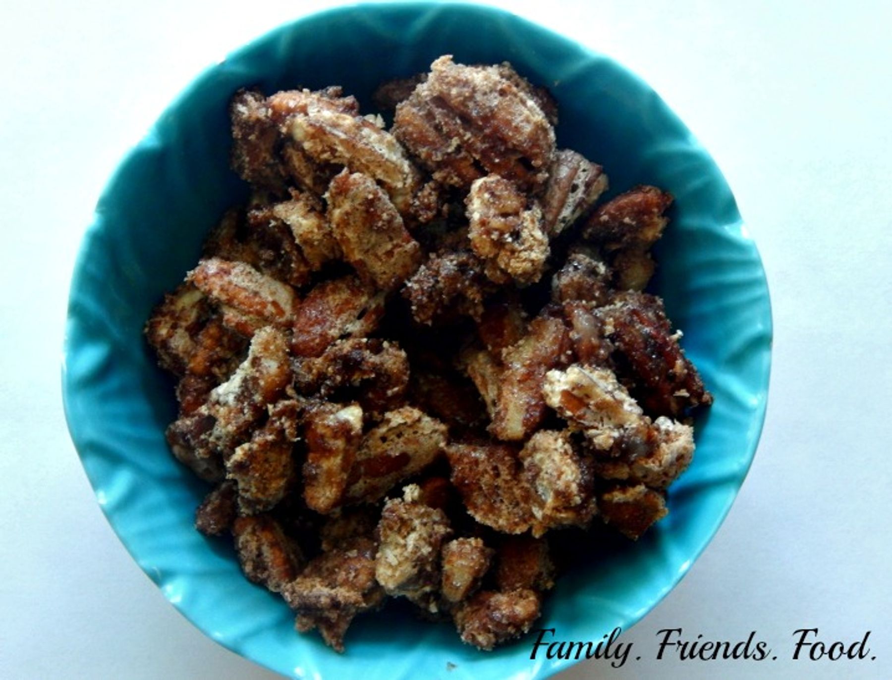 Whisk egg whites until bubbly. Whisk in the sugar and keep mixing until the sugar is dissolved and the mixture is fluffy. Mix in the cinnamon and pecans. Spread out...