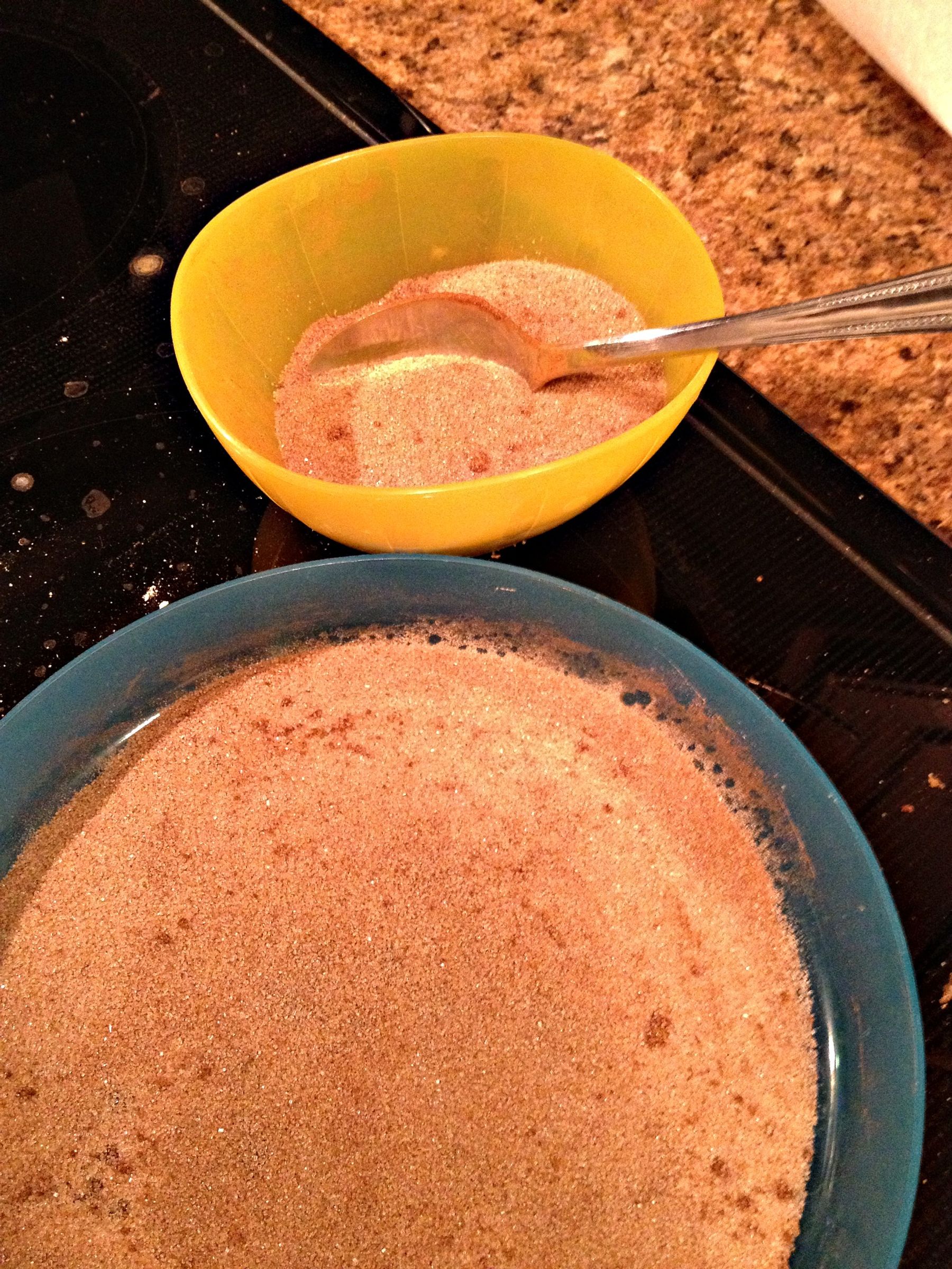 Mix cinnamon and sugar together (you might want to add a little more of one or the other to make it the mixture that you want). Put half the mixture on a plate and leave the other half in a bowl. Make...