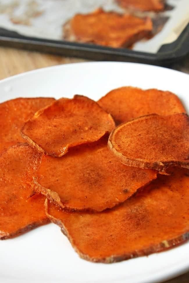 These Cinnamon Sugar Sweet Potato Chips are one of my favorite snacks. They’re super crispy and simply delicious. Sweet potatoes are a great alternative to regular potatoes since they have fewer calories, fewer carbs and more fiber. By baking them instead of frying them, you eliminate a lot of the fat and cholesterol. Season them with cinnamon and sugar and you eliminate the high salt too! You’ll love how quickly and simply you can make up a batch of these cinnamon sugar sweet potato chips!