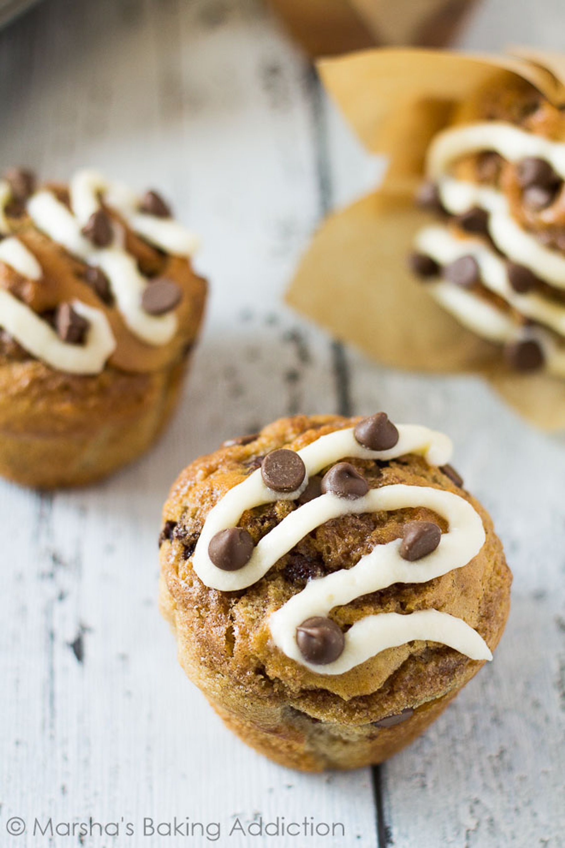Deliciously moist muffins with cinnamon swirl centres and tops, studded with chocolate chips and drizzled with a sweet cream cheese frosting!