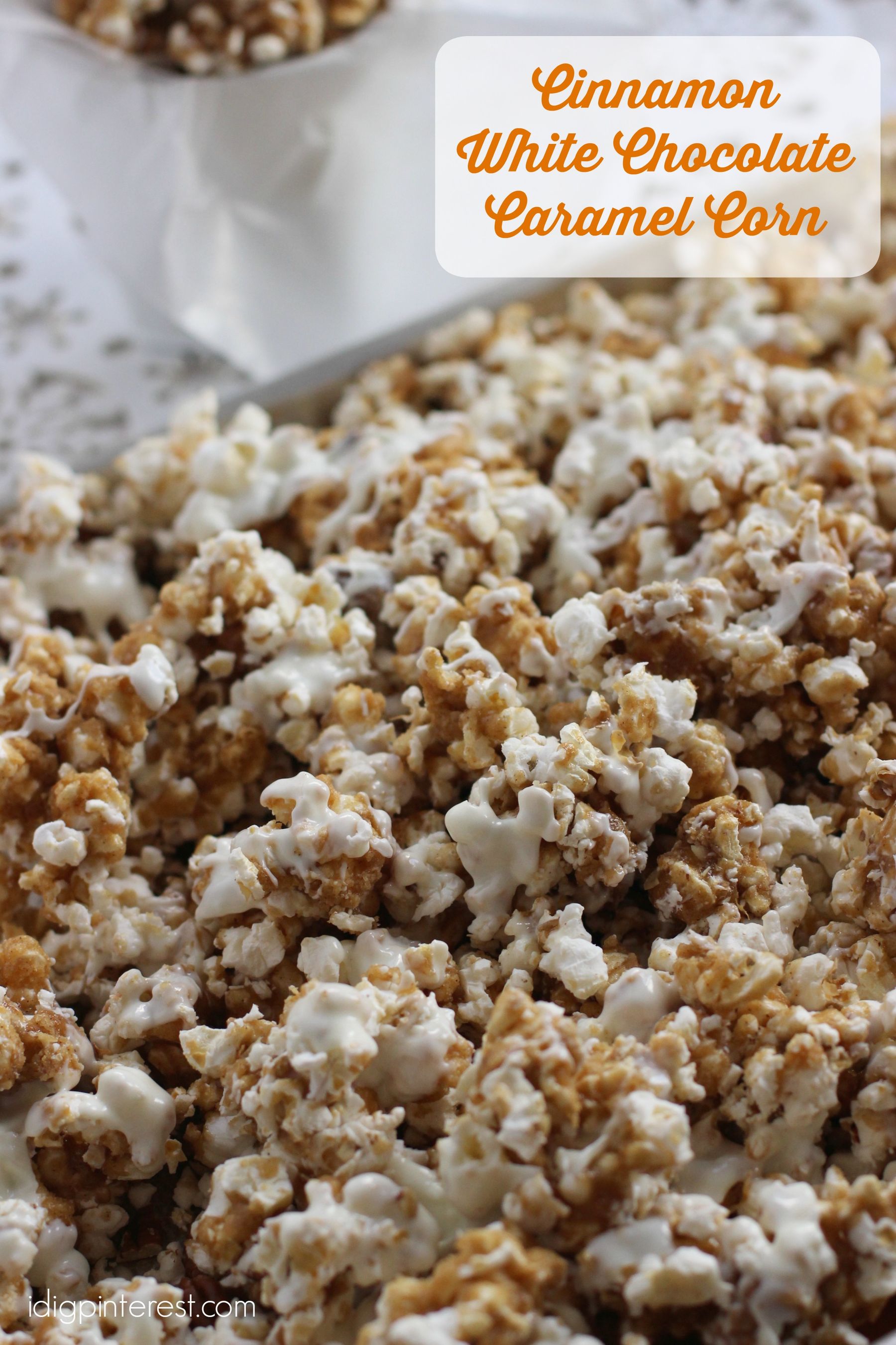 A phenomenal dessert mix with air-popped popcorn covered in a cinnamon caramel mixture, baked in the oven to perfection, then drizzled with melted white chocolate!