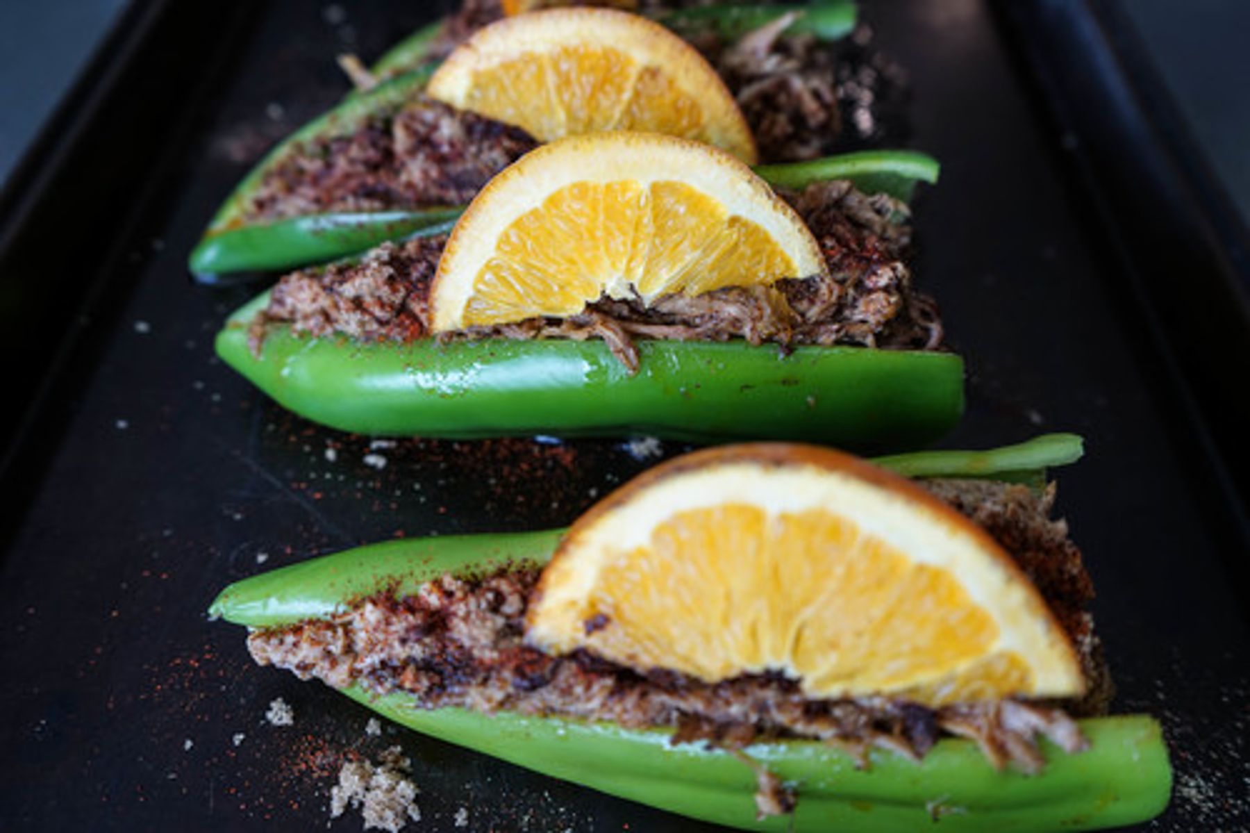 This is one of my favorite recipes I have created. Recently featured in Austin Fusion Magazine, this super easy dish is low carb, big taste. You will make this over and over again!! I used oranges, cumin, chili powder, all spice, cinnamon, cheyenne pepper, and brown sugar to spice the rump roast we then stuffed the pulled pork in Anaheim Peppers and garnished with Asian Pears and Cotija cheese (just leave off the cheese as a garnish to make this Paleo) Prep time is fast, roasting takes time
