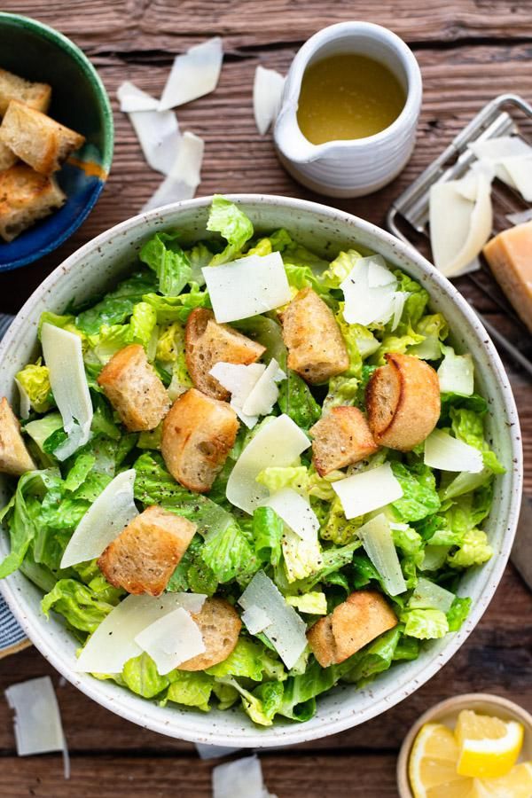 Whip up a restaurant-style classic Caesar salad recipe at home! Crisp Romaine lettuce is tossed with traditional Caesar salad dressing, shaved Parmesan, and homemade croutons. Serve it as a side dish with steak or fish, or add chicken or shrimp to make it a meal. This is the best Caesar salad you'll ever taste!