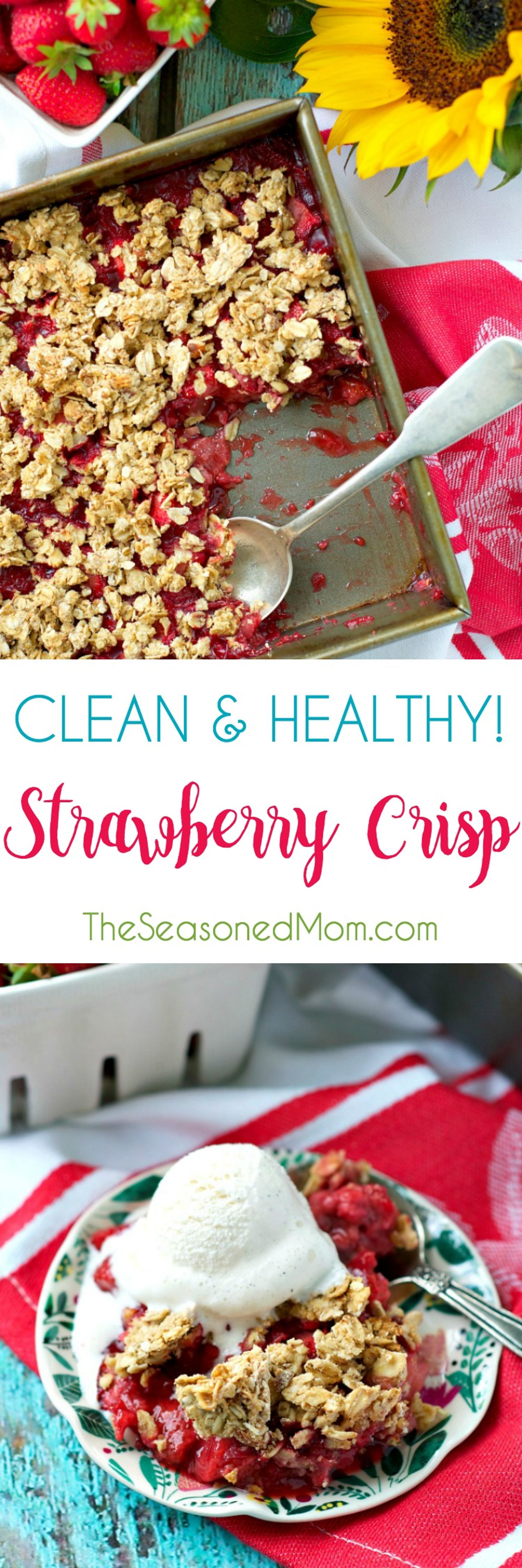 Fresh strawberries, whole grain oats, and crunchy almonds make this Clean and Healthy Strawberry Crisp an easy make ahead breakfast or low calorie dessert to enjoy all summer long! It’s gluten-free, contains no refined sugar, and uses simple, real food ingredients that you can feel good about feeding your family!