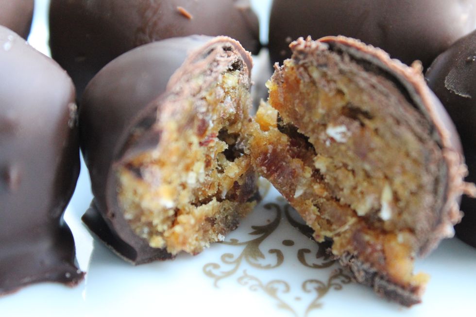 can't even EXPLAIN to you how amazing these bites are. They're like a decadent chocolate bar, mixed with a Reeses Peanut Butter Cup mixed with a little bit of rainbow/sunshine. I haven't even told you the best part! They are actually GOOD for you. They are filled with fiber, protein and with a coating of dark chocolate, you're getting tons of great nutrients for your body! Did I mention, they are DELICIOUS? Now, I've made a couple of changes to the recipe for my home