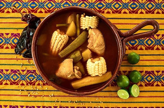 Mexican style chicken stew with a red guajillo chile and tomato broth prepared with white corn, chayote, zucchini squash, green beans, and epazote.