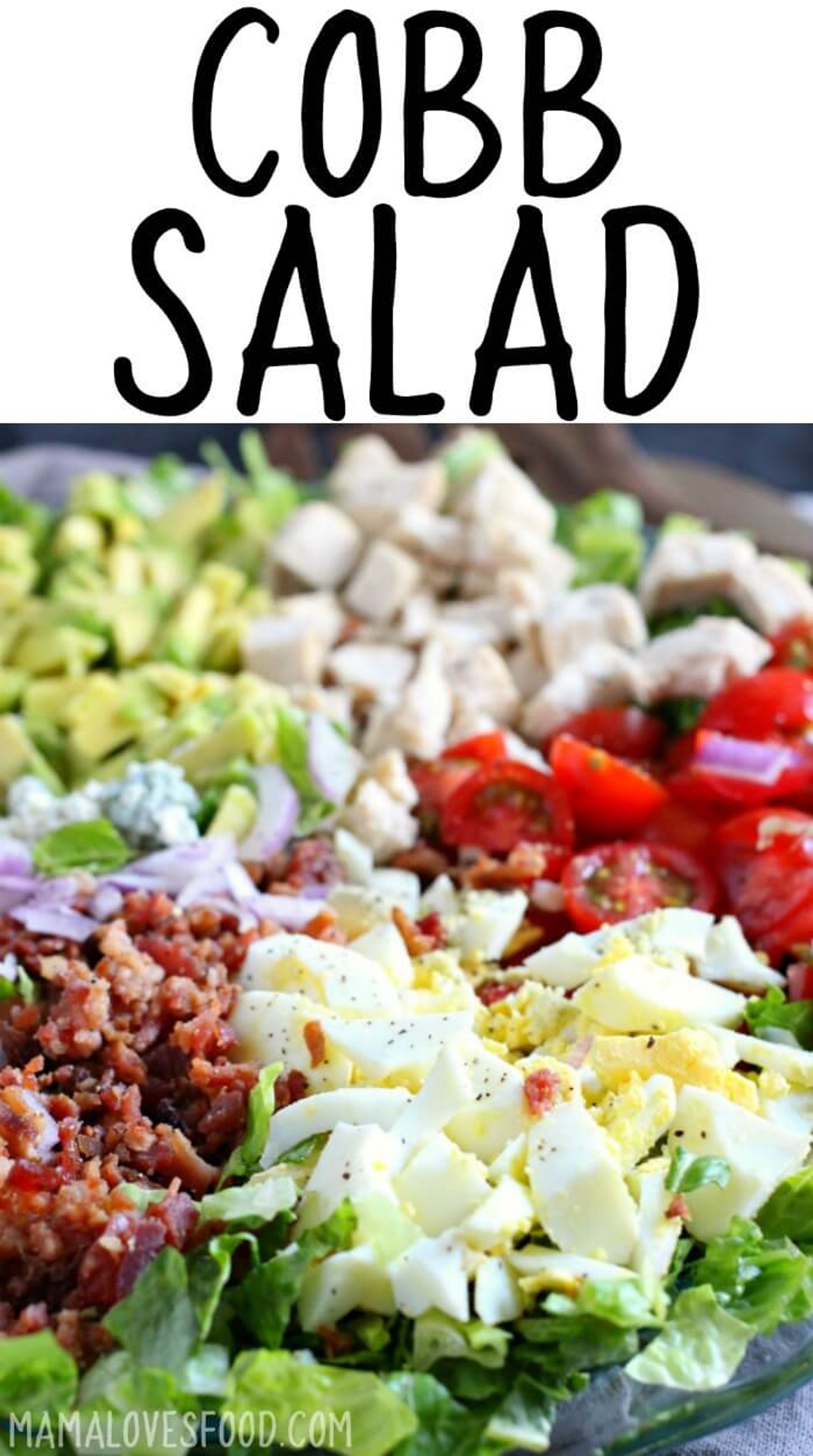 Cobb Salad is a healthy protein filled dinner idea full of delicious meats and veggies. Our cobb salad recipe is pretty classic using the traditional three proteins and salad veggies and dressed with a red wine vinaigrette.