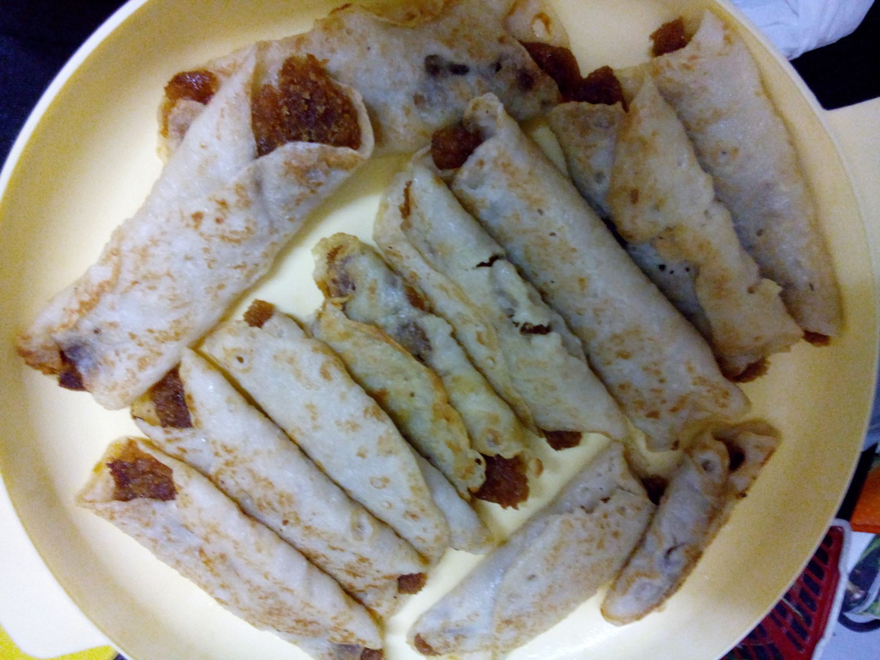5. Take a big Ladle. take one ladle full of the wrap mixture prepared earlier and spread it out on the pan similar to frying a pancake or an omlette. let one side become cooked light brown. then add sufficient amount of filling inside it roll it up and twist it now cook it for little more time and its dine. Prepare one by one.