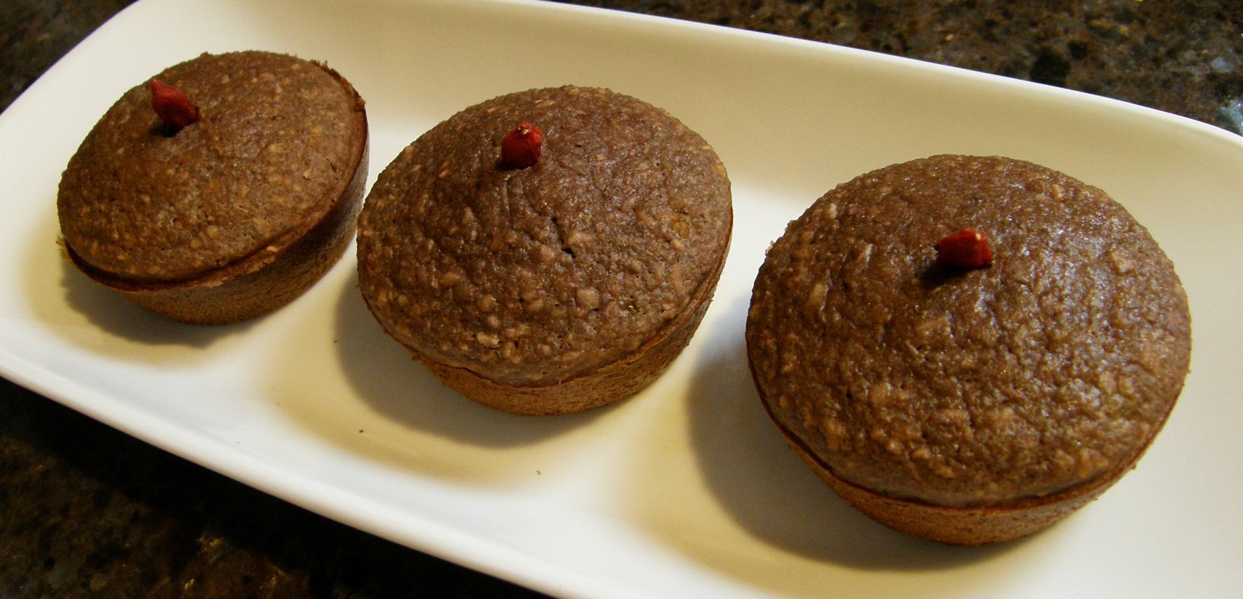 Place muffins in dish, then decorate with Goji berries or other dried fruit.