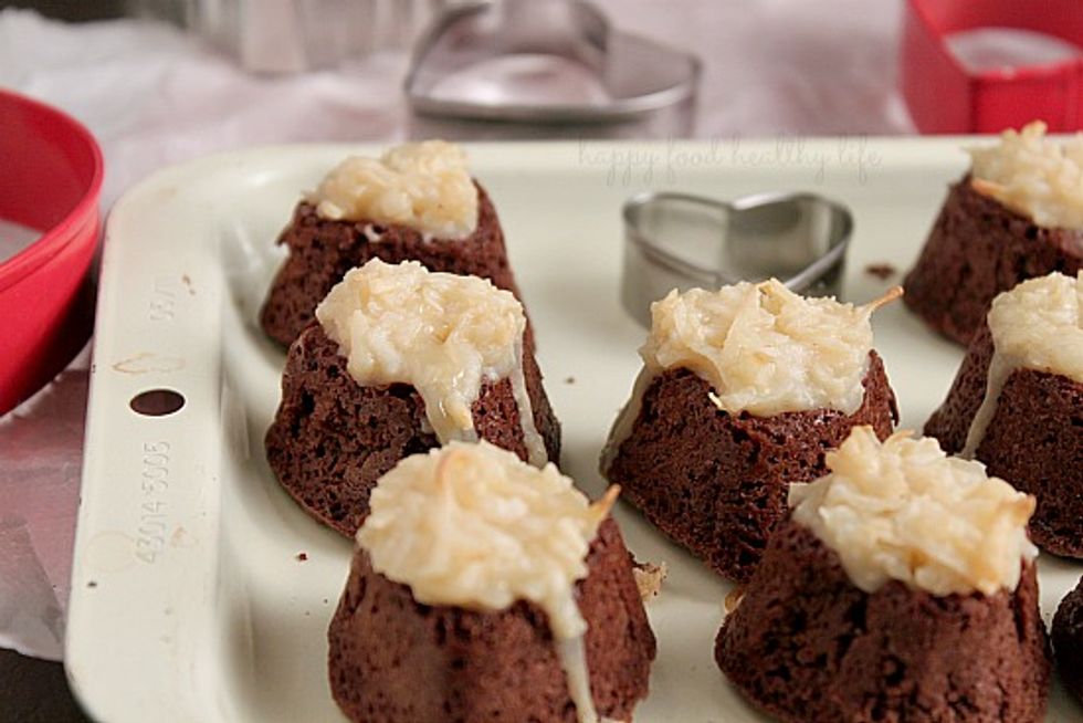 Simple little heart-shaped (or any shape you have a mold for) brownies, topped with a coconut-topping that very much resembles the inside of an almond joy!