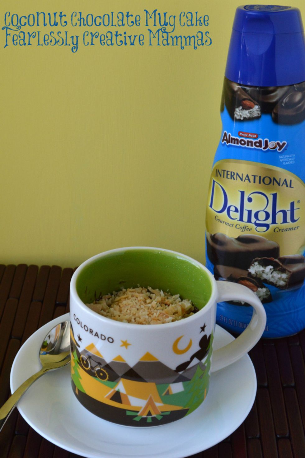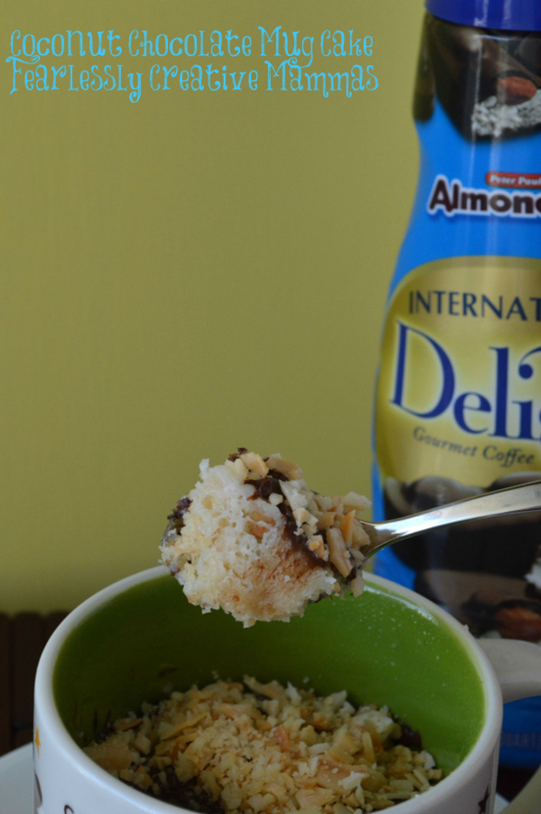 Grease a coffee mug well. In the mug, mix the flour, sugar, baking powder and salt. Add in creamer and oil and mix well. Add in 2 tablespoons toasted coconut and ½ tablespoon of chocolate chips and mix...