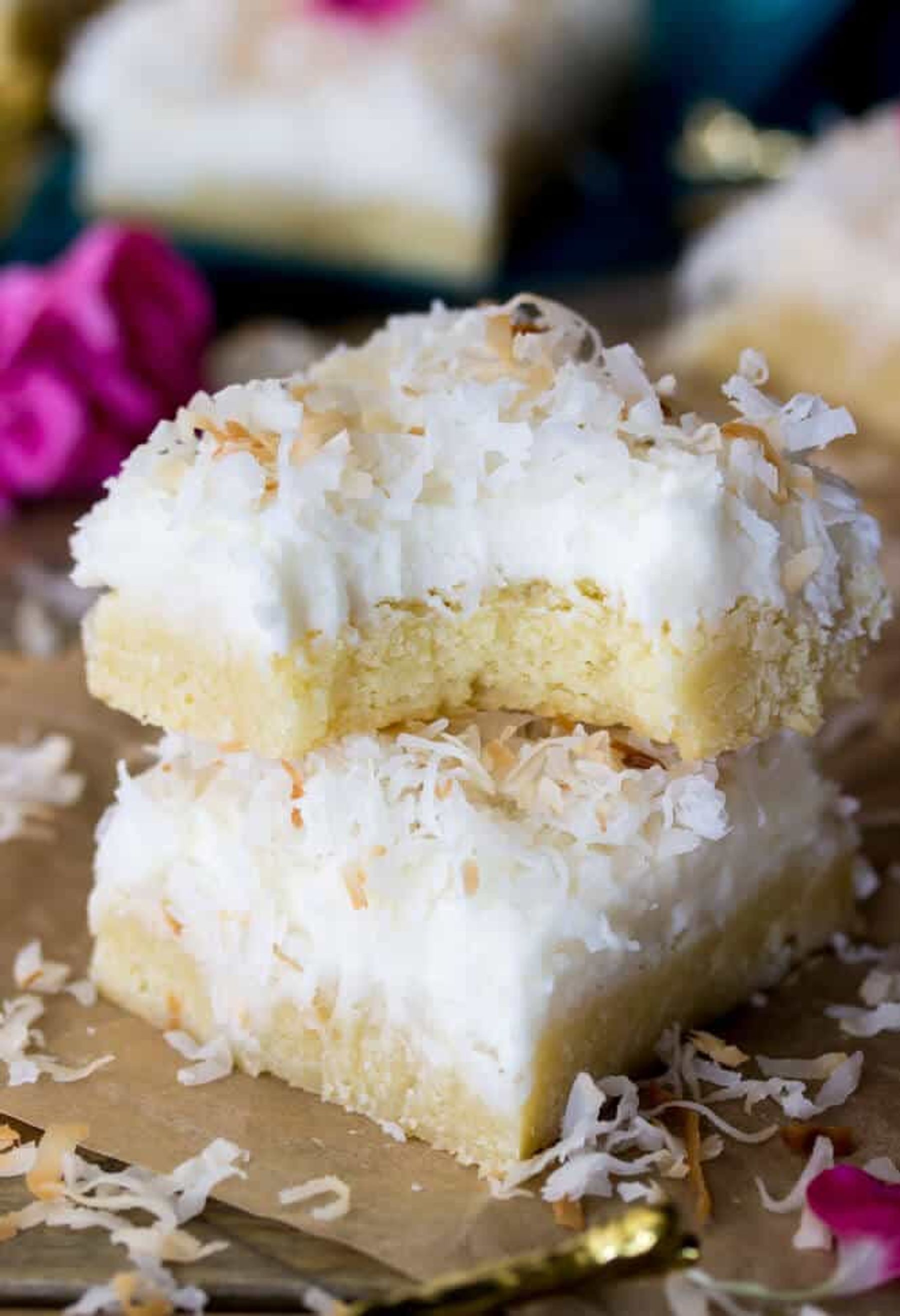 Coconut Cream Bars! Buttery soft cookie bars topped with a light refreshing coconut cream frosting and topped off with toasted shredded coconut.
