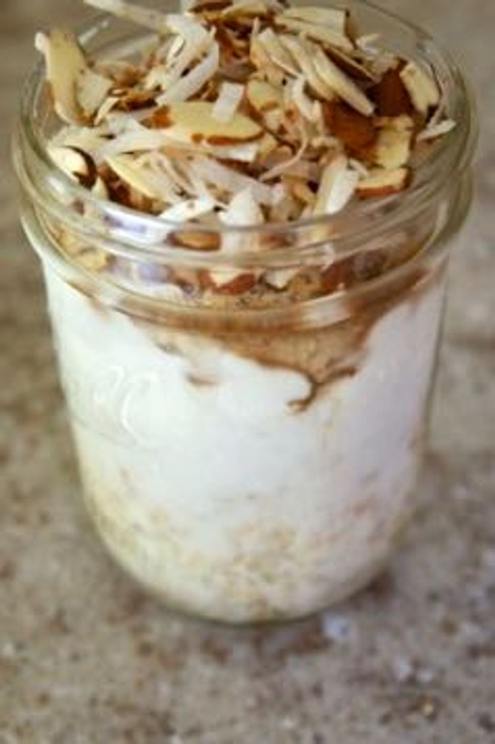 In a large mason jar or container add the oats, milk, cinnamon and then the vanilla. Stir everything together. Top with the greek yogurt, cover and refrigerate overnight.