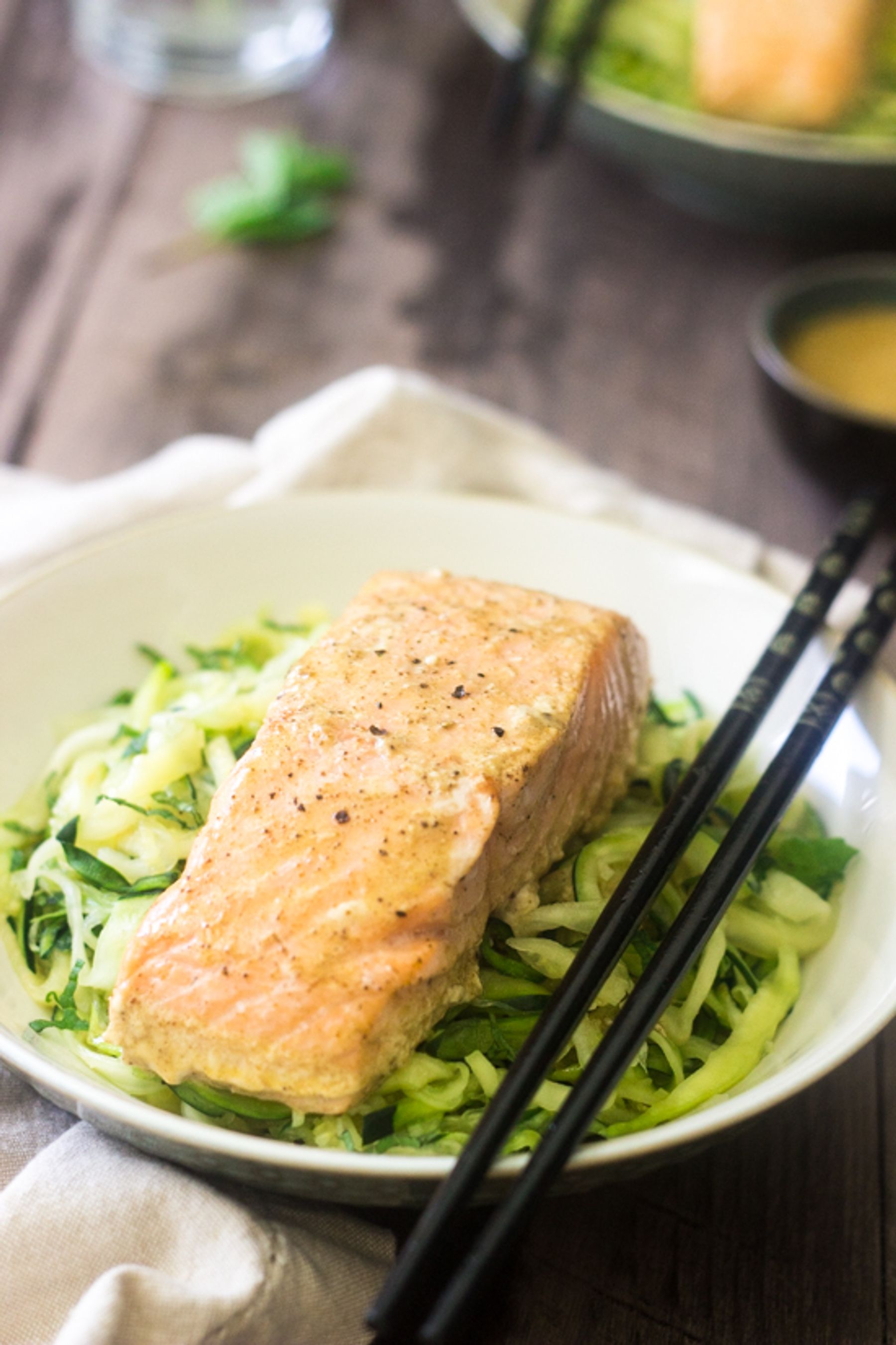 Zucchini noodles are topped with salmon in a SUPER easy, 3-ingredient coconut curry sauce for a light and healthy meal that feels fancy!