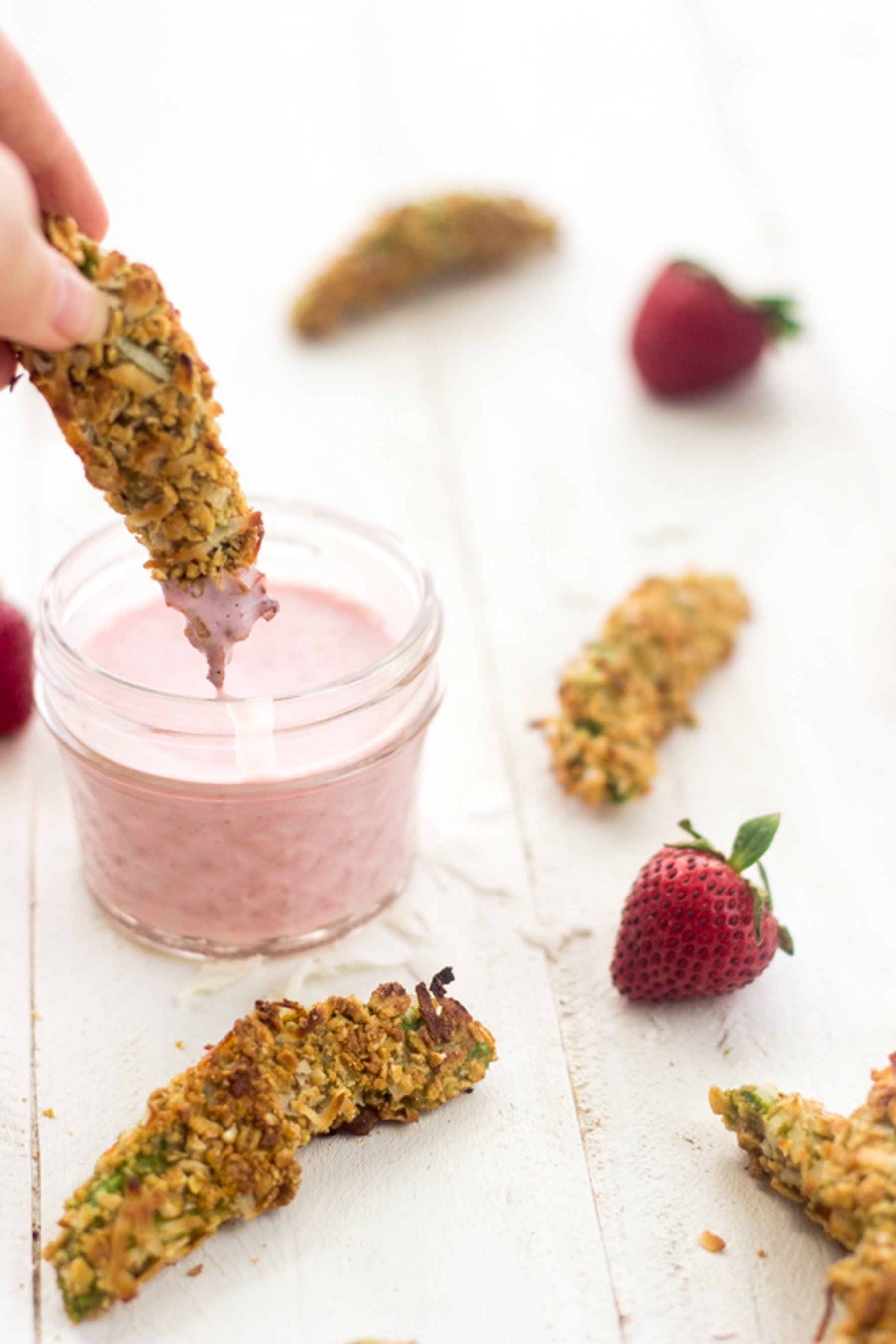 These quick and easy avocado fries are crusted in honey granola and brown sugar and served with a healthy strawberry Greek yogurt dip!