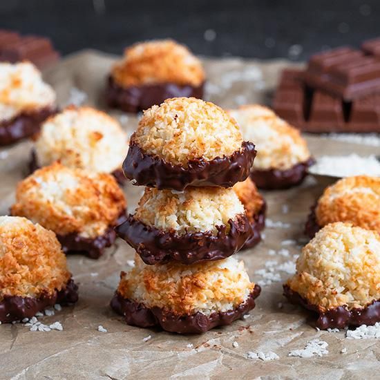 Coconut Macaroons Annie NgaiFebruary 02, 2021 50 These Coconut Macaroons are ridiculously easy to make and only need a few ingredients! Baked until golden and dipped in chocolate, they're the perfect bitesize treat!18Find the recipe here!See the full directions on my site