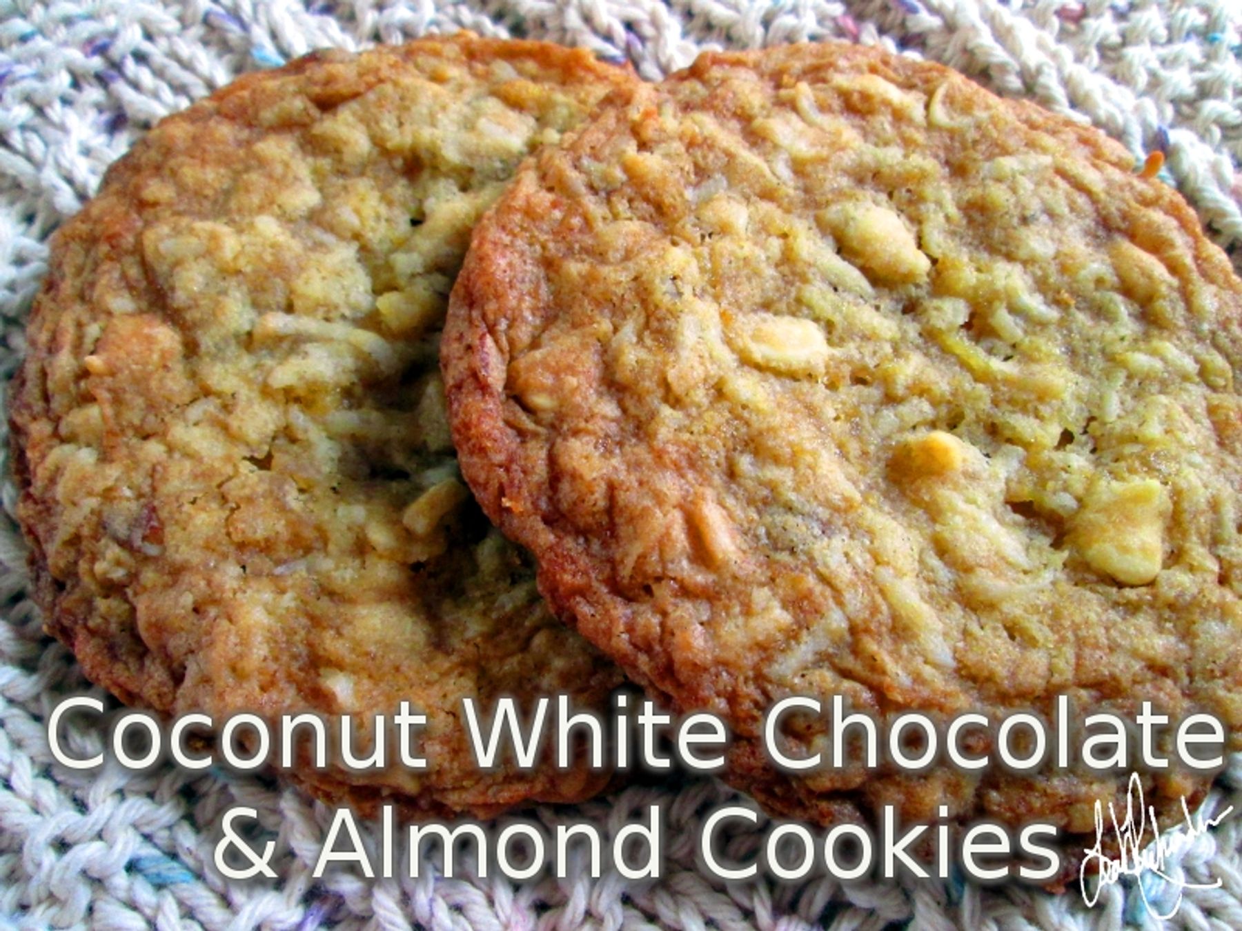 In a large bowl, cream butter and sugar until light and fluffy. Add the egg, vanilla, and milk and mix well. By hand, stir in the flour, salt, baking powder, and baking soda just until mixed. Add the almonds, coconut, and white chocolate chips and stir until incorporated.