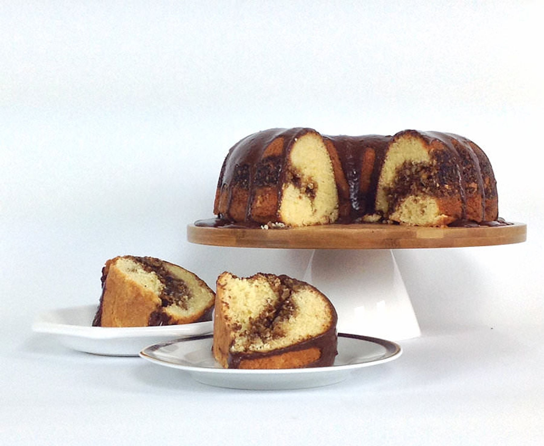 This Coffee Cake with Nuts and Chocolate Glaze is crumbly, with a layer of mixed nuts, sugar and cinnamon in the middle and a chocolate glaze on top.