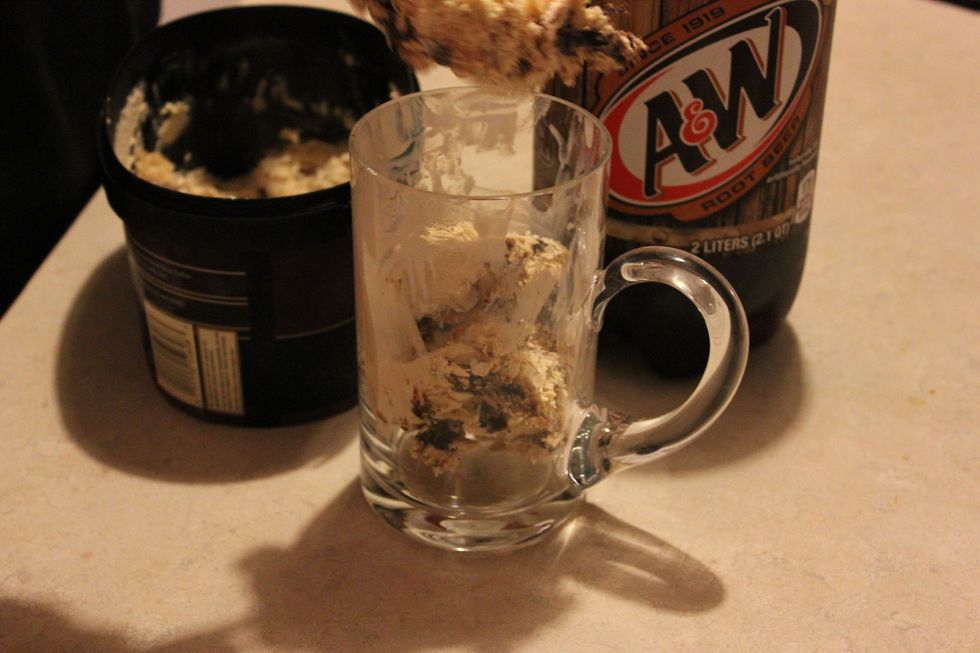 Two scoops of cookies and cream ice cream into a large frosted glass