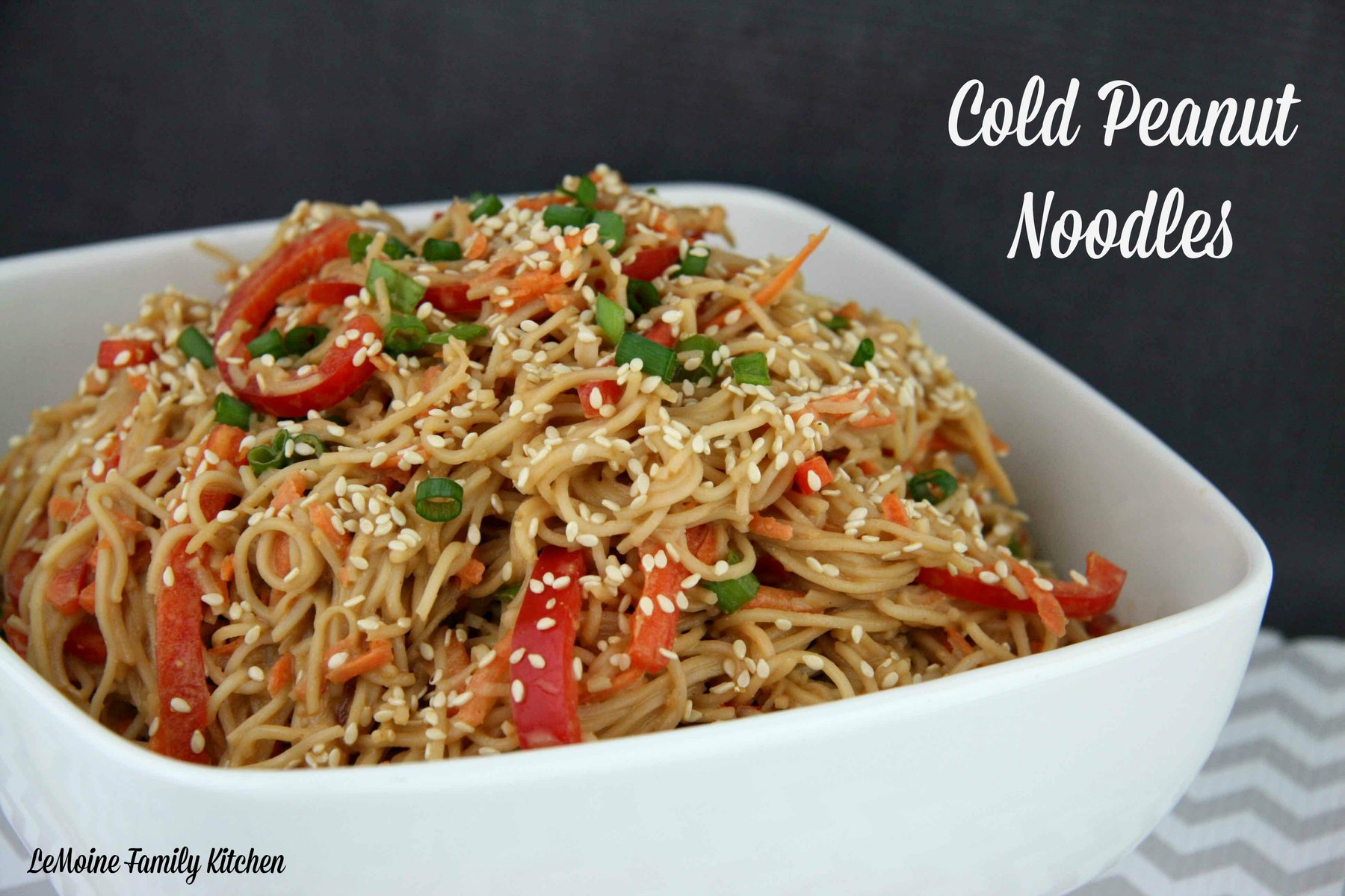 I really love a good cold noodle dish, especially with Asian flare and these Cold Peanut Noodles totally hit it on the head! Chinese noodles are tossed with a simple sauce made of peanut butter, soy sauce, rice vinegar, chili garlic sauce and a little water. To add to the flavors, colors and texture of these noodles I also tossed in some thinly sliced red bell peppers, shredded carrots, scallions and topped it all off with toasted sesame seeds.