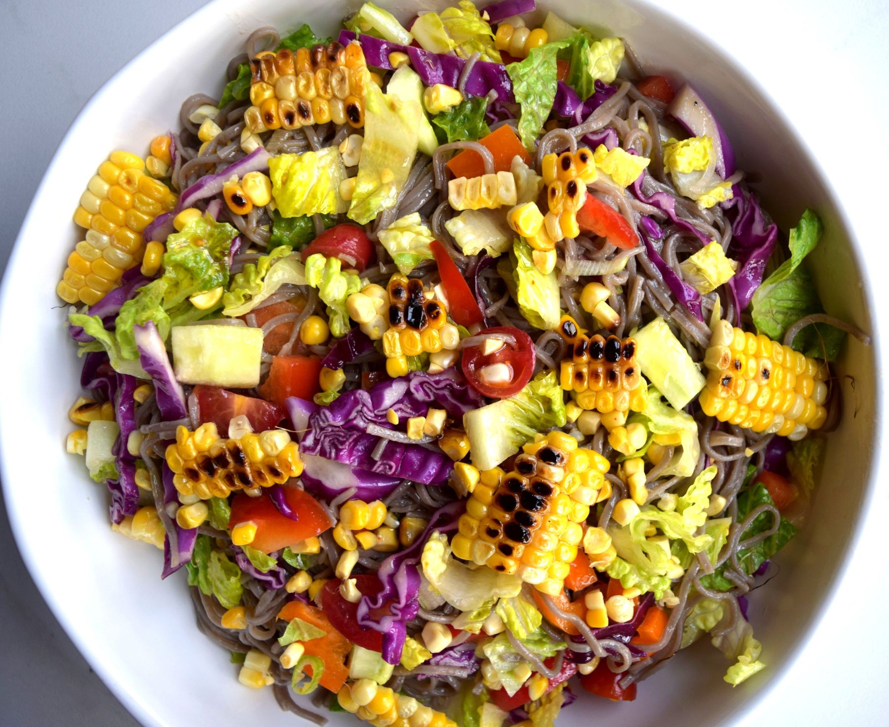 Cold soba noodles with bright, crunchy vegetables and a sesame sriracha dressing