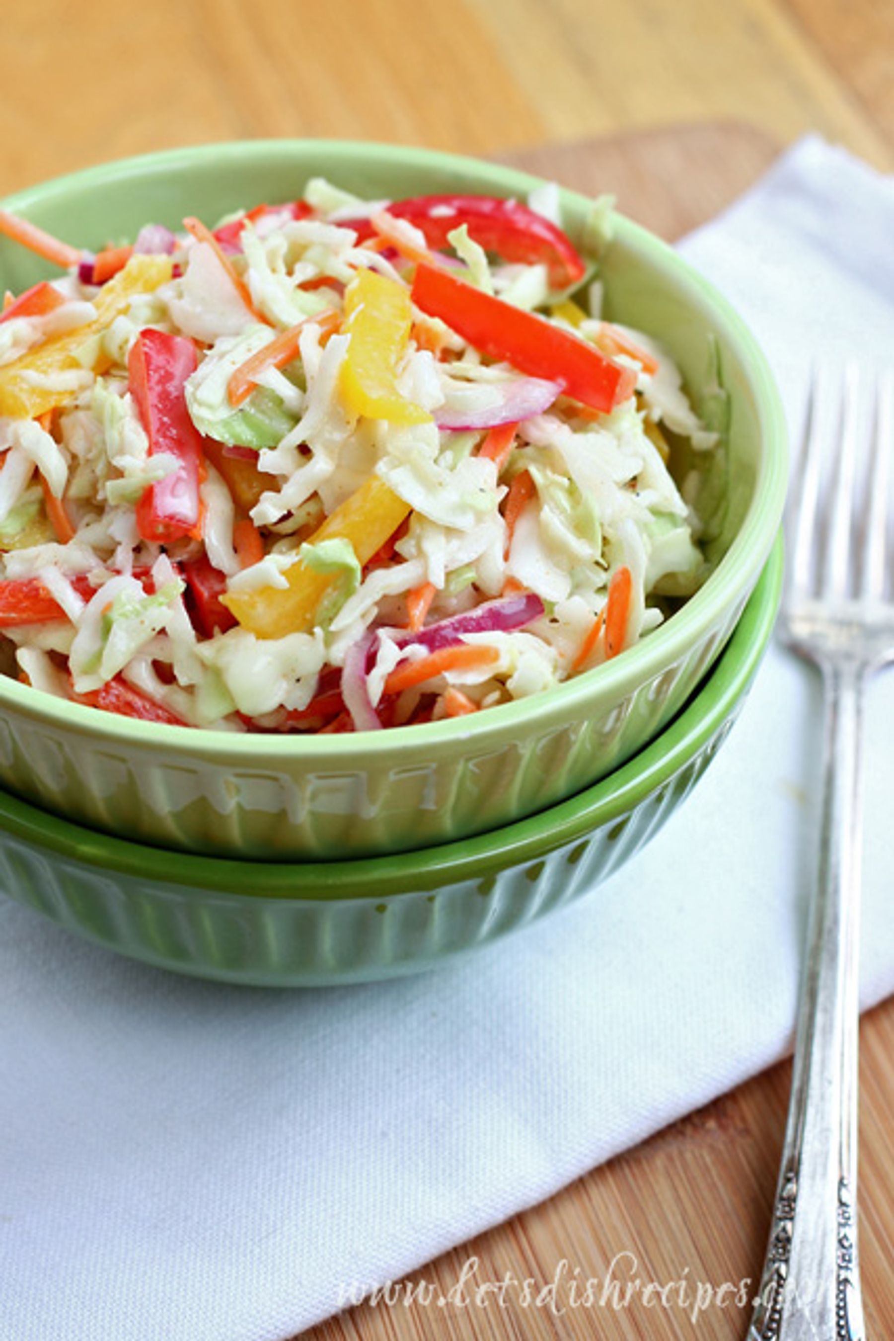 In a large bowl, whisk together the mayonnaise, olive oil, lime zest, lime juice, dill, sugar, celery salt and cumin. Season with salt and pepper, to taste. Add the cabbage, carrots, onions and peppers, and...