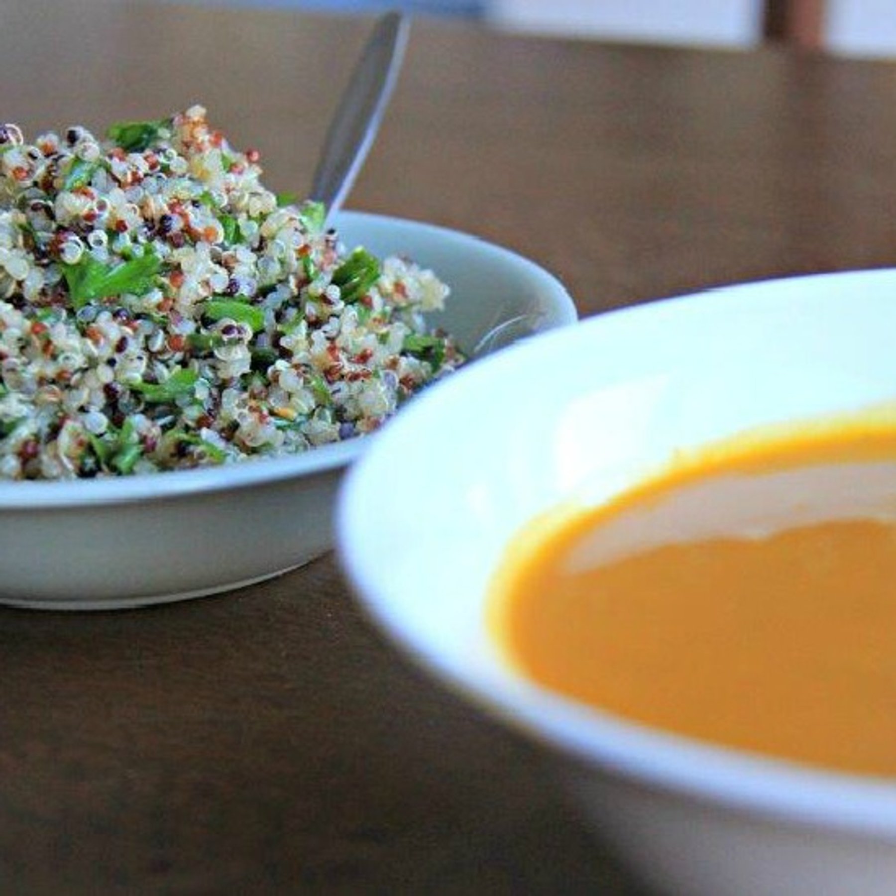 Butternut squash quinoa soup is great comfort food, and is our version of squash (pumpkin) soup, so well-loved around the world. We roast butternut squash with garlic, cumin and honey and then use this as the base for the soup. Topped with a garnish of spiced quinoa, the soup takes on a bit of crunch and a slight heat