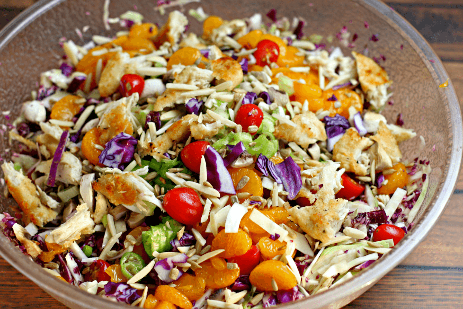 Confetti Cabbage Salad is festively bright and tasty with crispy vegetables, flavorful chicken bites, crunchy nuts and an incredible sweet-tart dressing!
