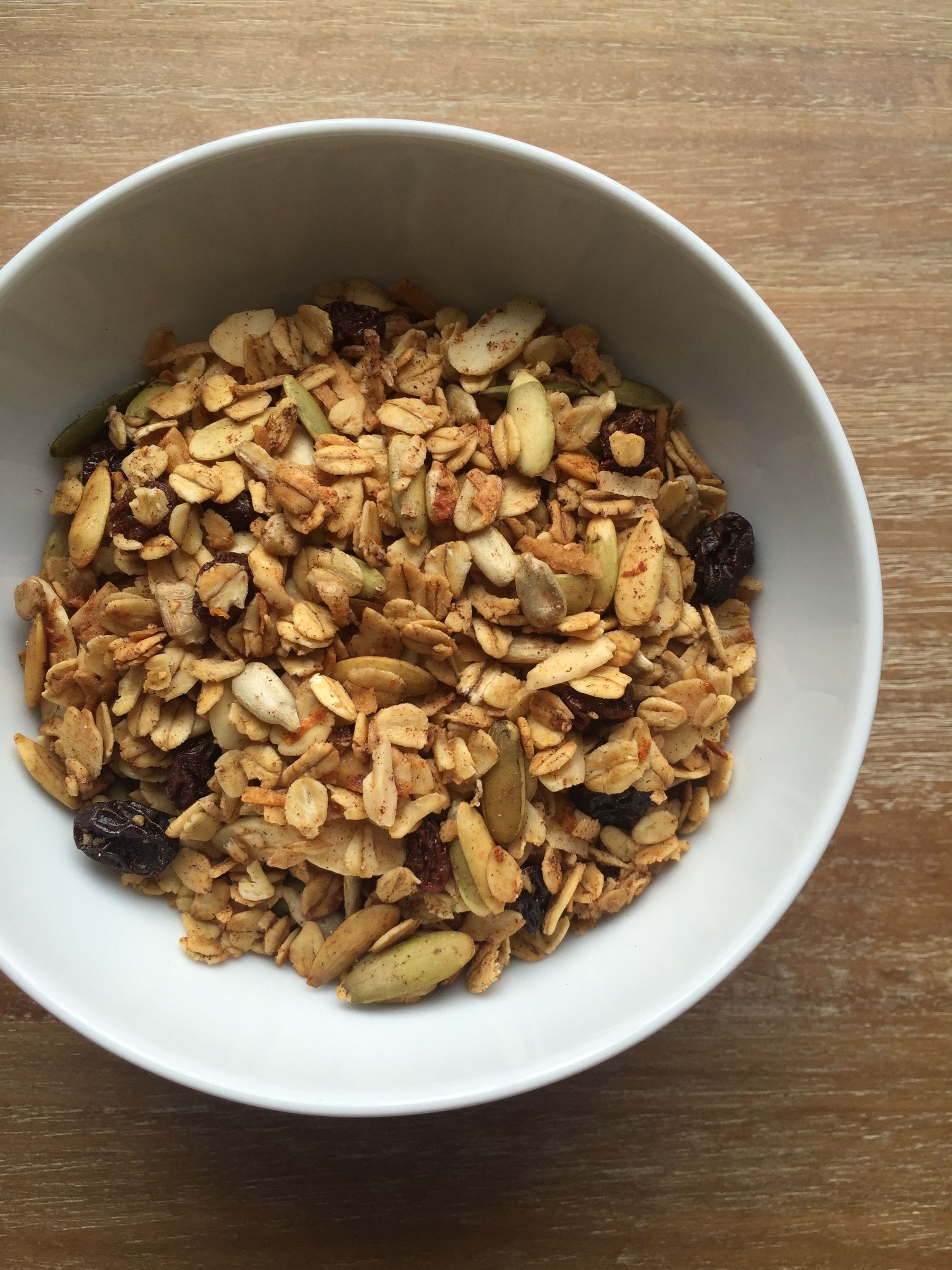 This granola is a simple, nutritious and hearty recipe that will give you the energy to conquer the day! It is full of heart healthy and fiber rich oats, sunflower seeds, pumpkin seeds, almonds and shredded coconut. It is also relatively low in sugar, as it is sweetened with 1/2 cup maple syrup. If you would like to make the recipe vegan you can substitute equal parts coconut oil for the butter. Enjoy!