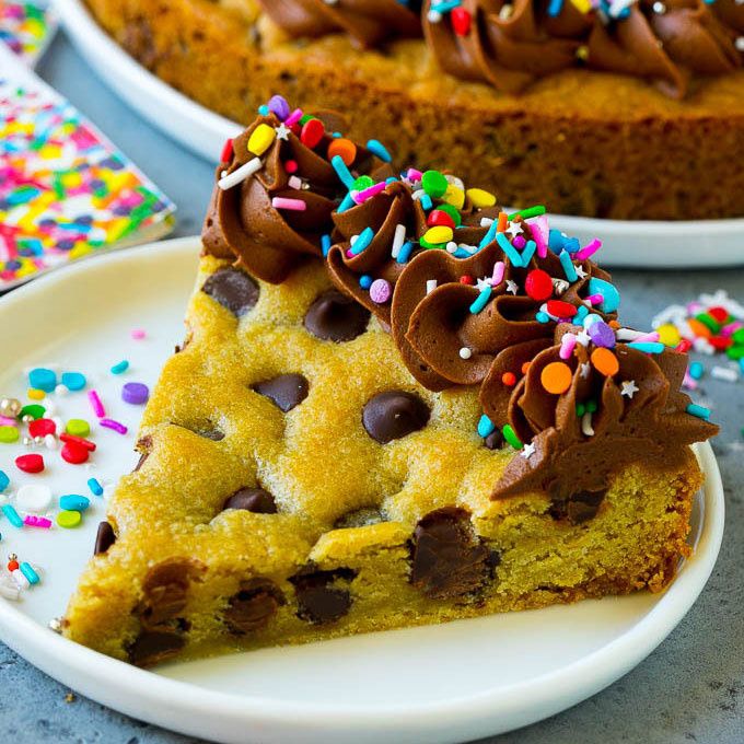 This cookie cake is giant brown sugar chocolate chip cookie that's topped with creamy chocolate frosting and colorful sprinkles. The perfect treat for any celebration!