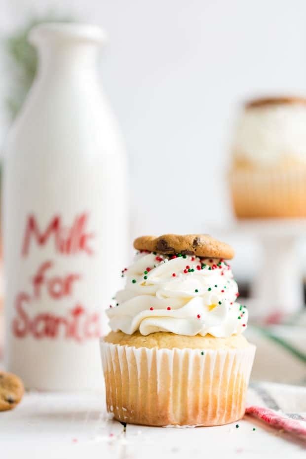 Delicious, homemade, cookie filled vanilla cupcakes are the perfect sweet treat. A rich, chocolate chip filled dough makes the best filling for a yummy, fresh cupcake. Topped with sweet frosting, everyone will love them.