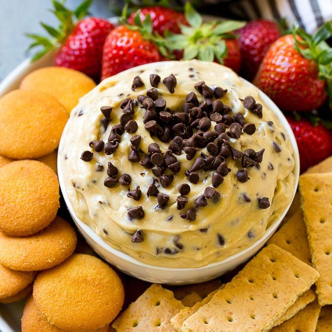 This cookie dough dip tastes like chocolate chip cookies, but is egg free and flour free making it totally safe to eat! Serve your cookie dough dip with graham crackers, vanilla wafers and fruit for a fun and unexpected snack or dessert.