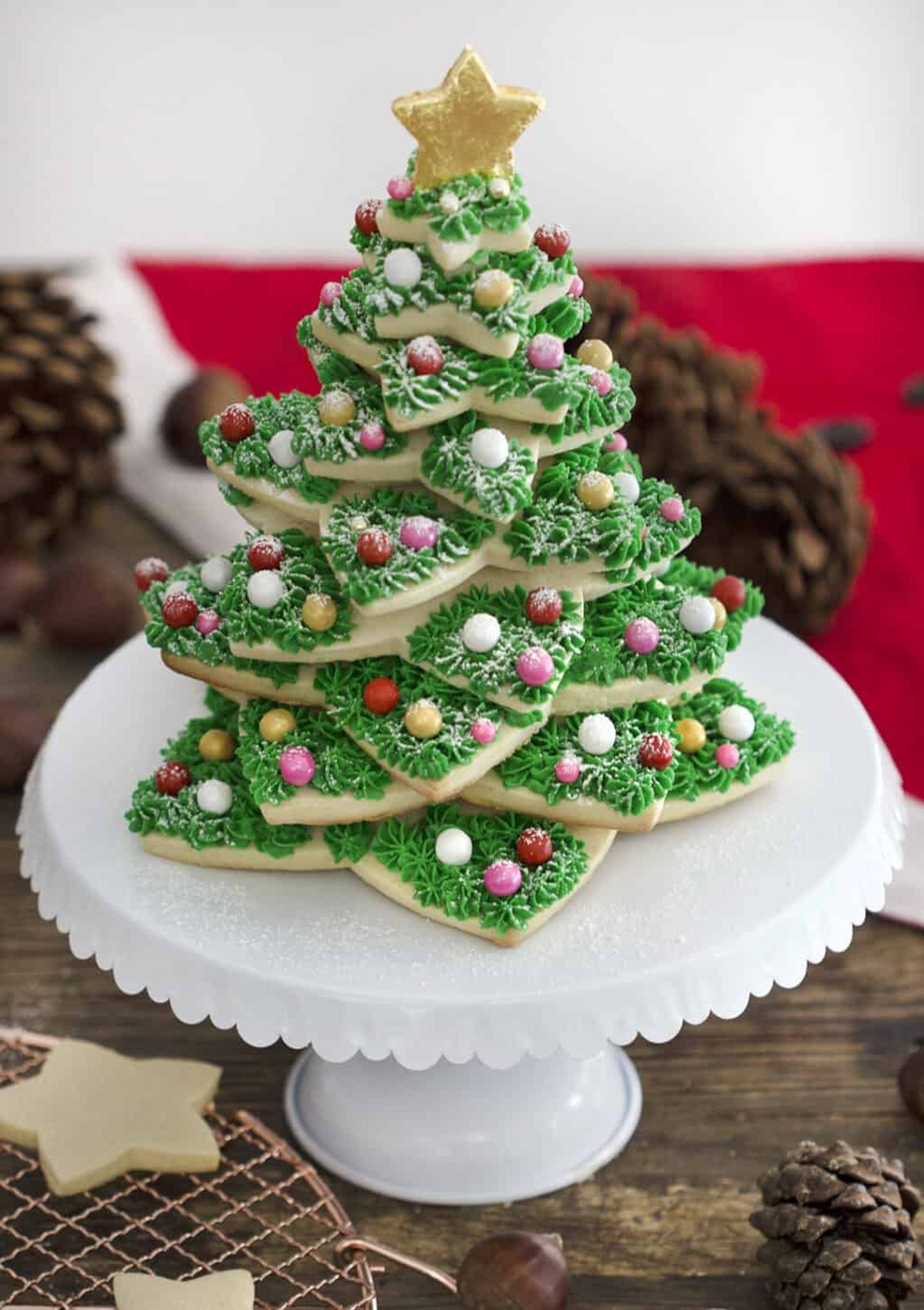 I finished off the tree with a sprinkling of powdered sugar and a golden star! I love breaking out the edible gold leaf, yes it's expensive but you end up using it in moderation and it makes such an impact. To make my golden star I painted on a thin layer or sugar glaze and the gold stuck right on! As you can see in the video I cut double the needed stars to give my tree some height. Pipe buttercream to attach each layer using a small closed star tip. If you’ve tried these cookies then don’t forget to