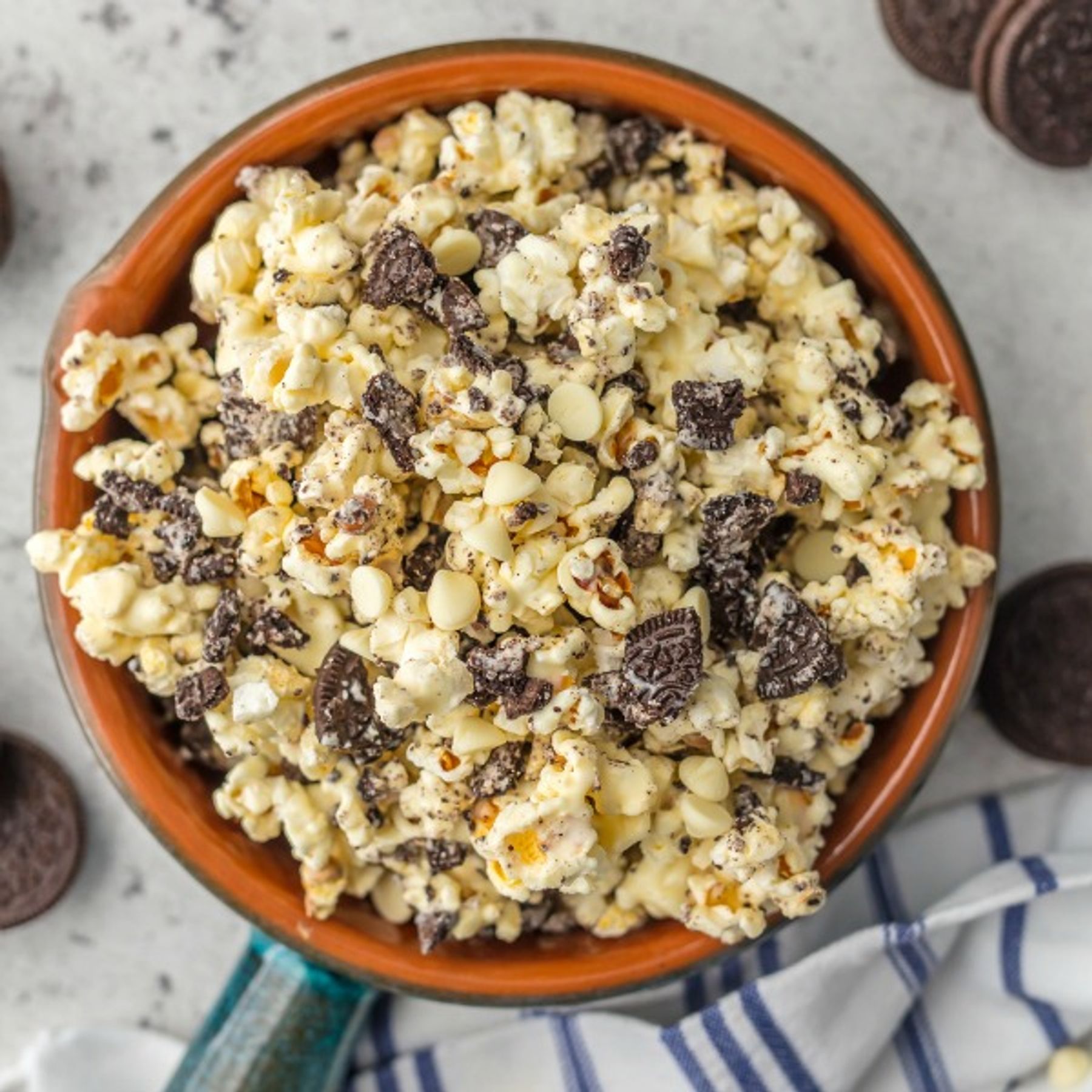 This COOKIES AND CREAM POPCORN made with white chocolate and oreos is SO easy and delicious! The perfect sweet snack for tailgating, parties, or just a simple dessert at home. Salty and sweet for the win!