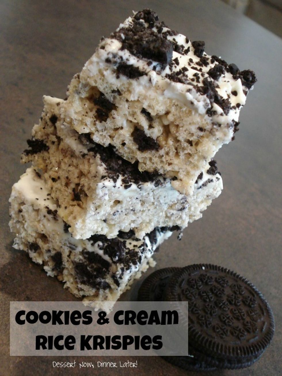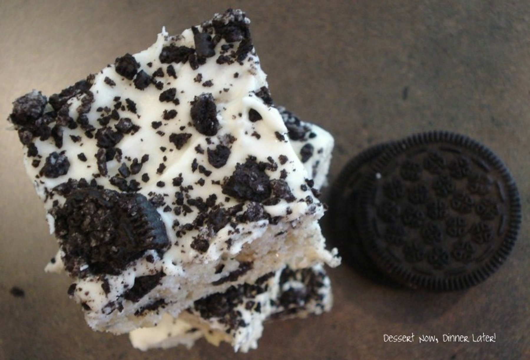 White chocolate topped rice krispies with chunks of oreo cookies. Kid-favorite!