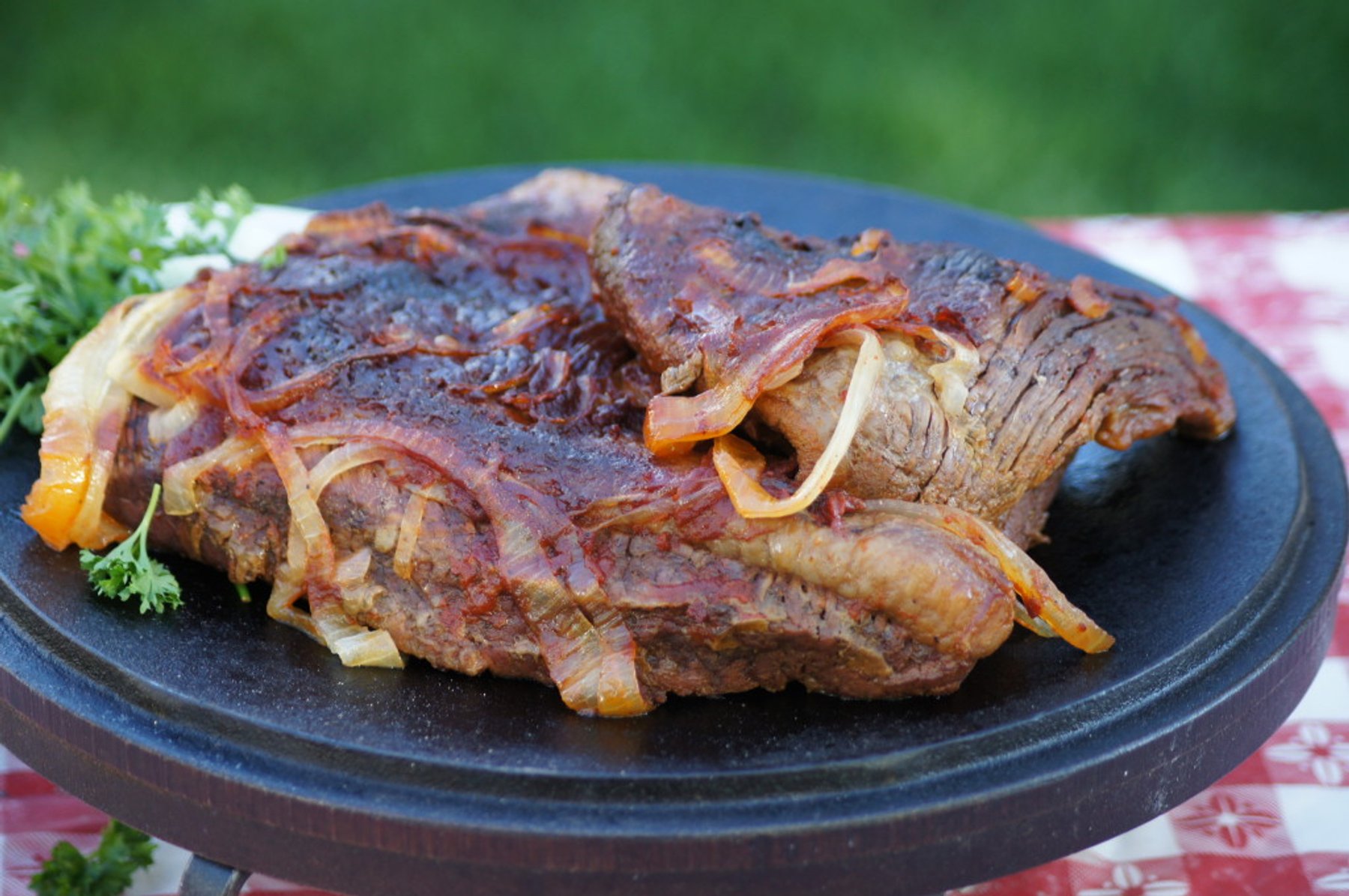 Place brisket in Dutch oven and bake at 275° (12 on top 6 on bottom) for 2 hours, replacing charcoal as needed. While the brisket is cooking, in a sauce pan combine all the ingredients for the sauce and...