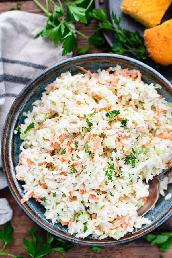 The best homemade coleslaw features finely shredded cabbage and carrots that are tossed in a sweet, creamy, and tangy dressing. This simple, make-ahead side dish tastes just like the KFC coleslaw recipe! Serve it with fried chicken, pulled pork barbecue, fried shrimp or crab cakes and cornbread. The versatile and easy slaw will soon become a family favorite!