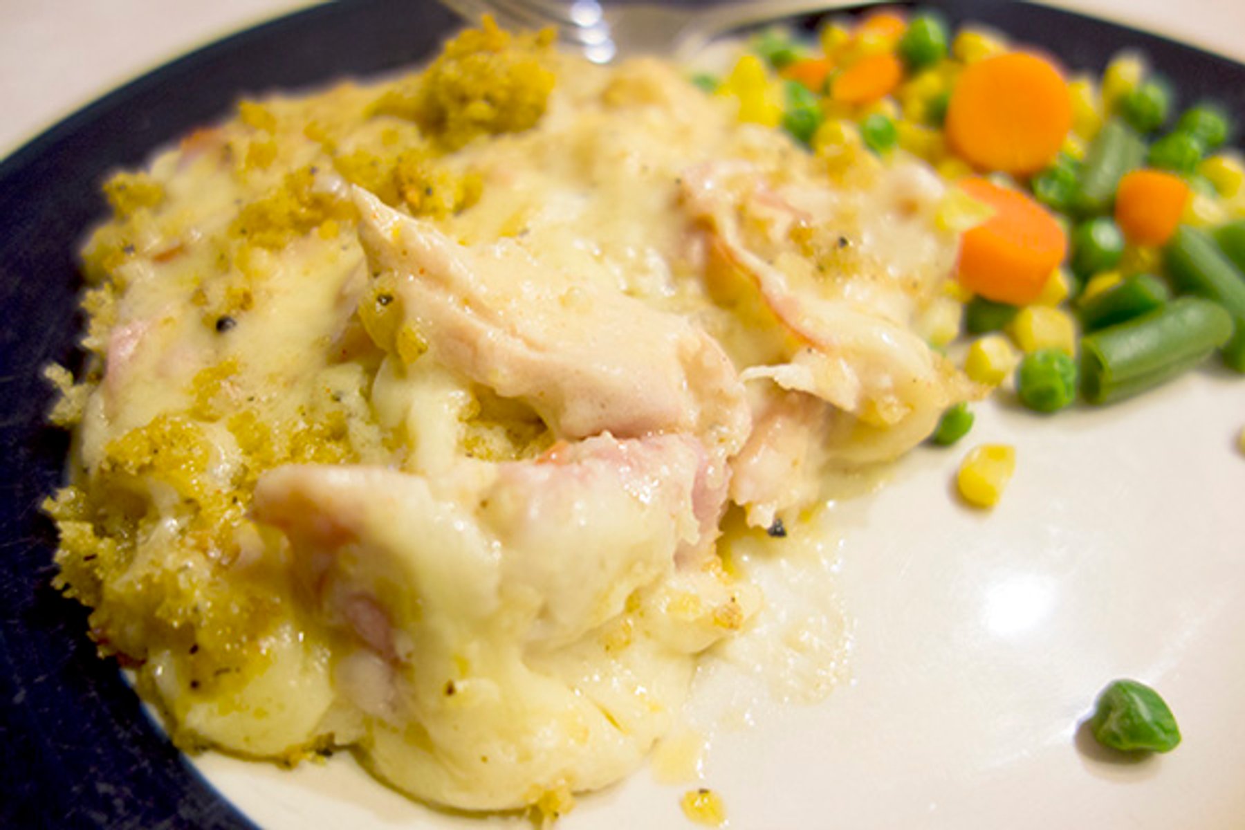 Place shredded chicken breasts on the bottom of the baking dish. Take the slices of ham and chop it up and scatter it over the chicken. Lay the...