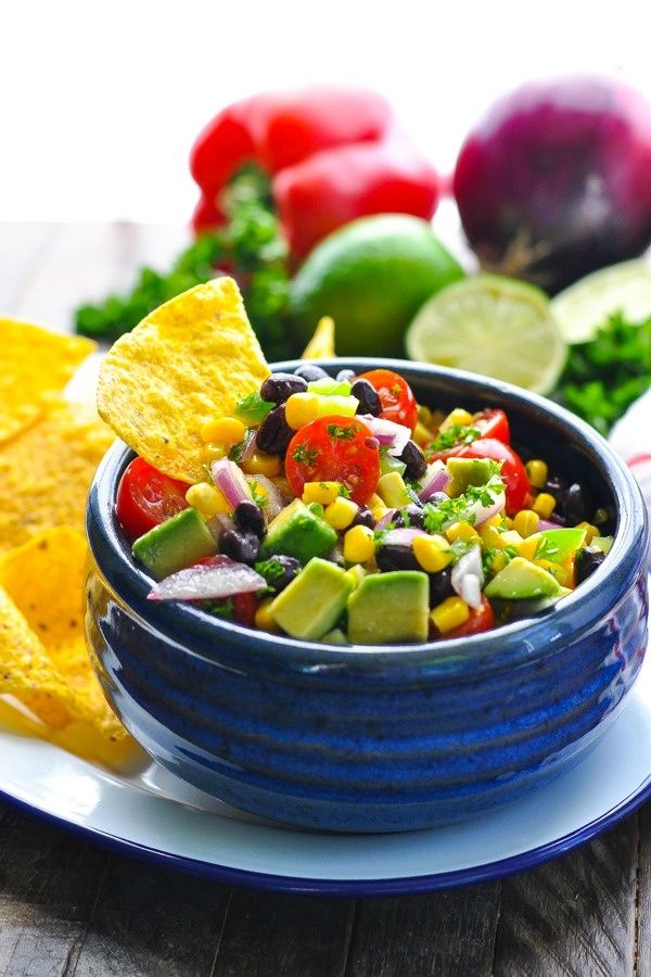 When I was growing up, my mom often served a healthy Black Bean and Corn Salad alongside tacos, quesadillas or grilled chicken. It's a nice change from a green lettuce salad, and the fresh avocado, tomato and vegetables create a great salsa for dipping, too!