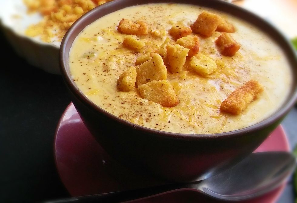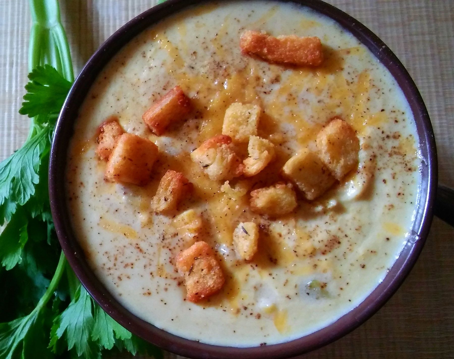 CORN AND POTATO CHOWDER WITH GARLIC AND HERB CROUTONS