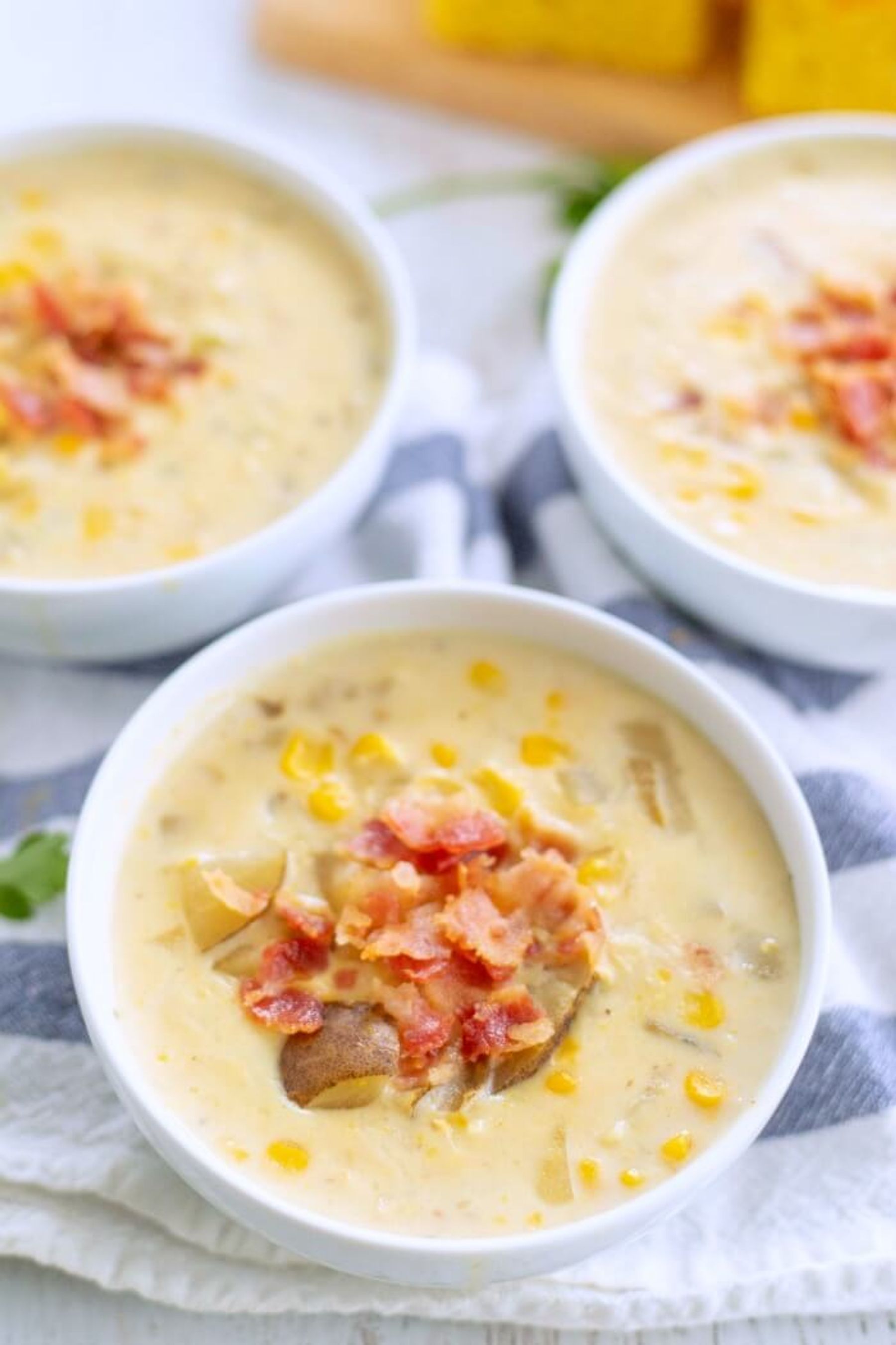 Corn Chowder is the ultimate comfort food. Rich cream, hearty potatoes, sweet corn, and delicious bacon make this a FIVE STAR meal!