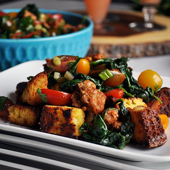 This cornbread salad starts with cubes of Jalapeño Cheddar Cornbread dried in the oven then tossed with Italian sausage, cherry tomatoes, and spinach in a quick vinaigrette. It is a surprisingly delicious and unique meal that the whole family will love, even the biggest skeptics.