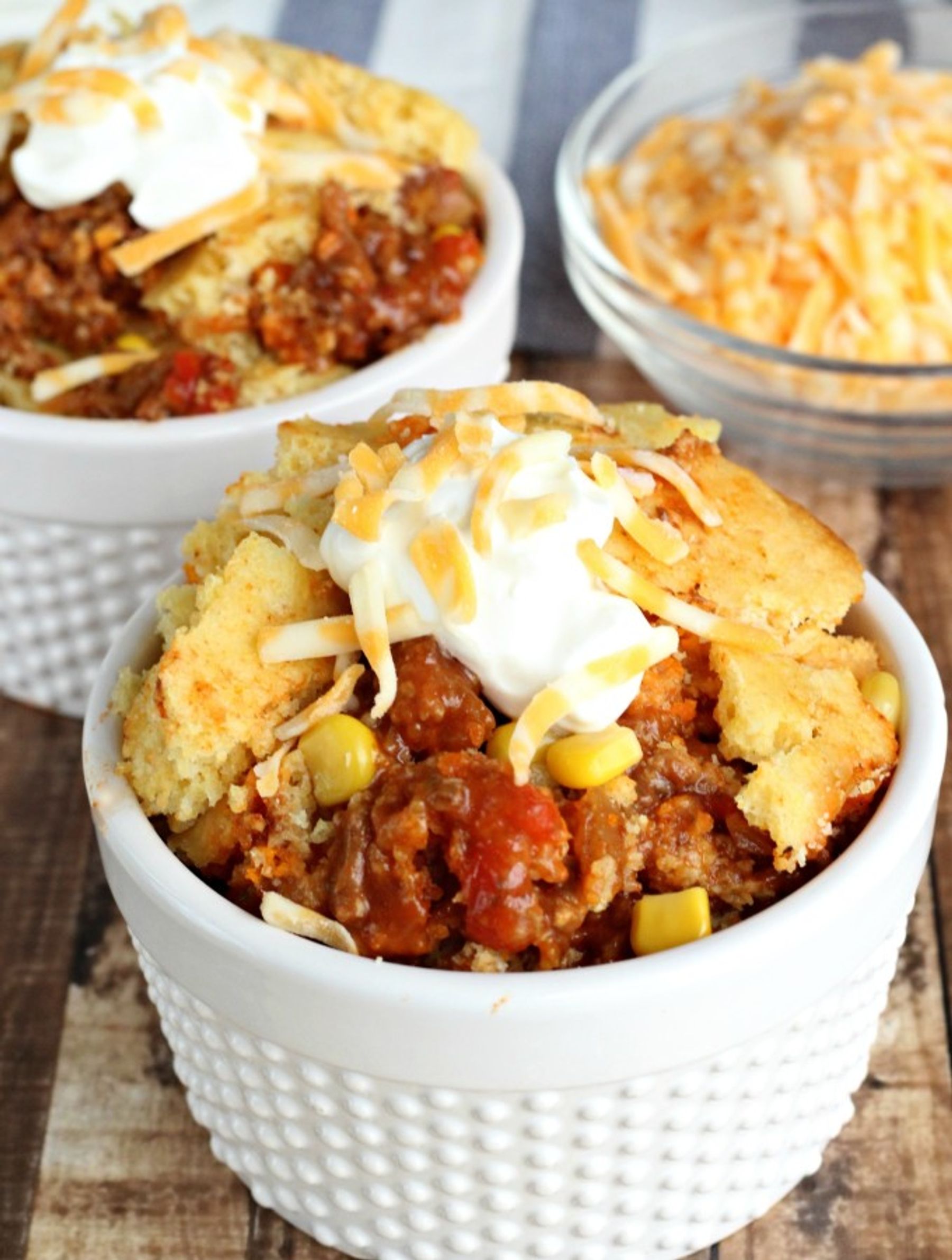 Chili and cheesy cornbread cooked together in a slow cooker. Warm up with a bowl of slow cooker chili!