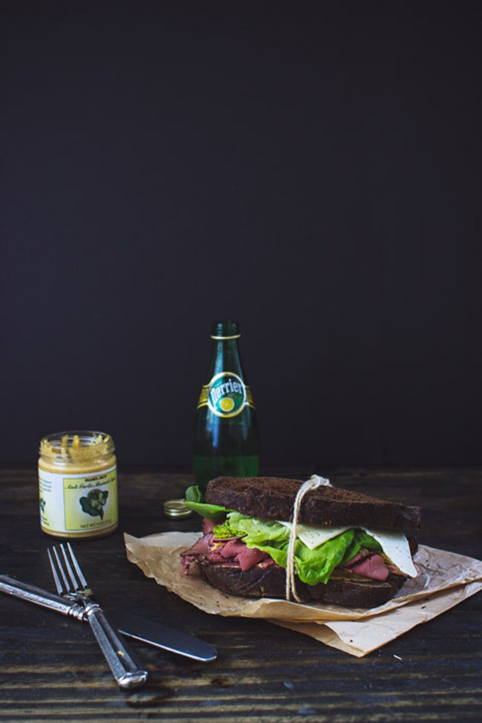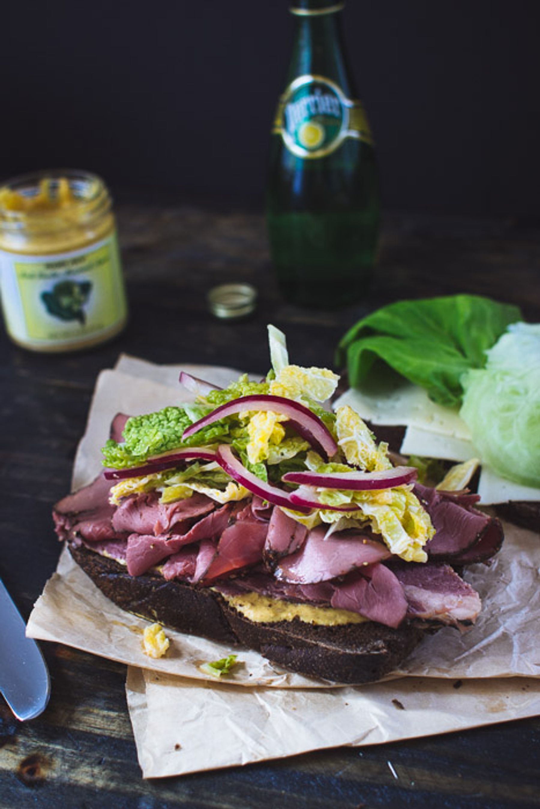 Corned beef and pastrami on pumpernickel bread topped with a special green apple slaw!