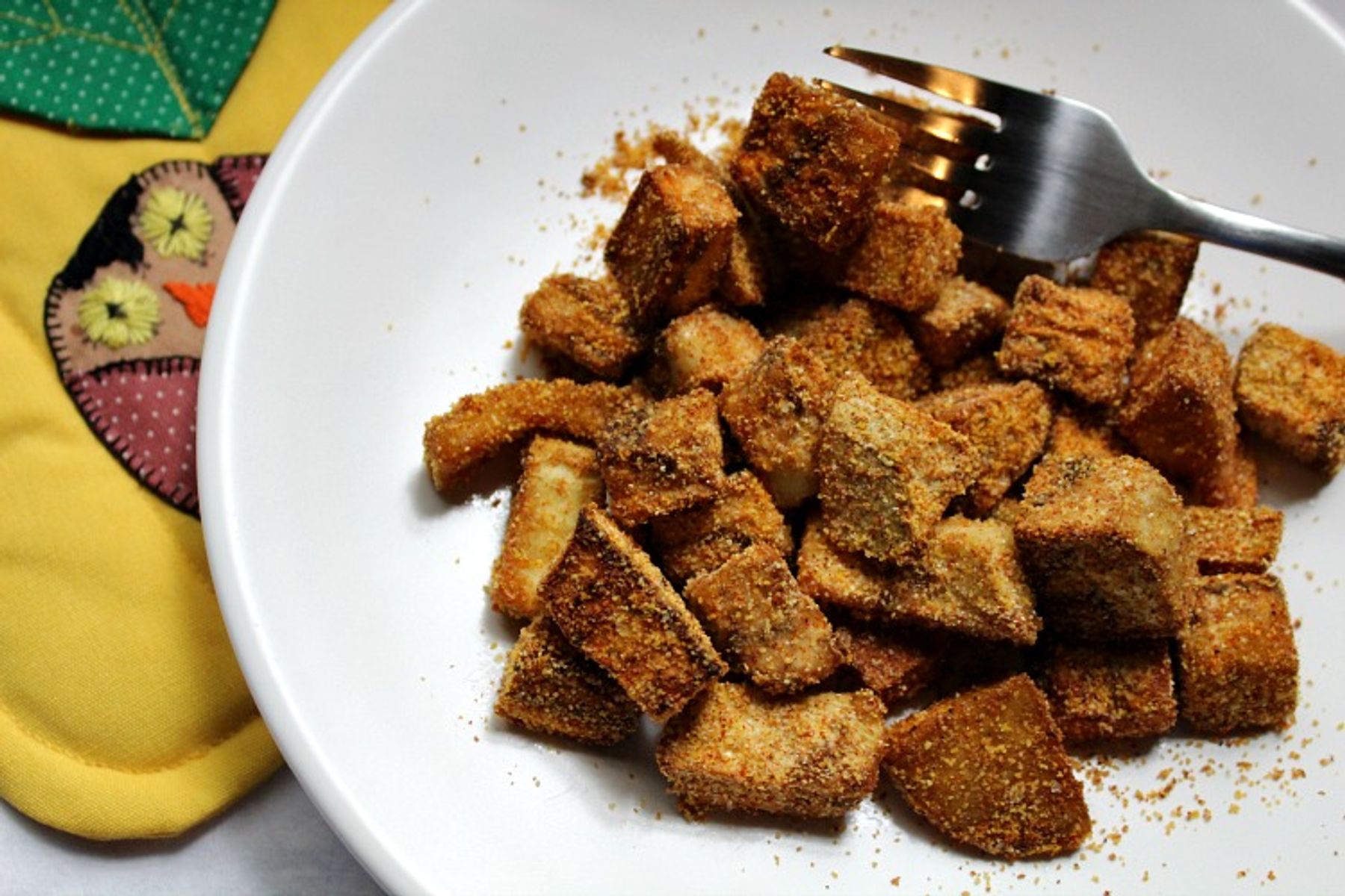Place cubed eggplant in a large zip-top bag. Add olive oil to bag and toss to coat. Add flour, cornmeal, and seasonings to bag and shake again to coat. Spread...