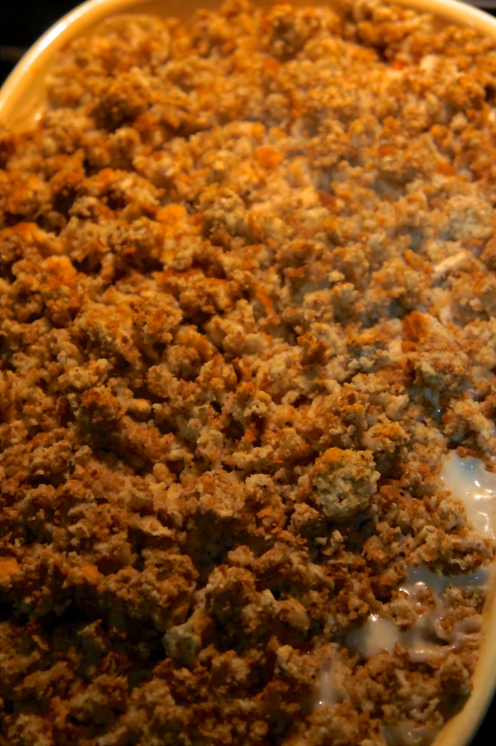 In a large bowl combine both soups, milk, thyme, pepper, vegetables and turkey. Spoon into a 3 quart shallow baking dish.