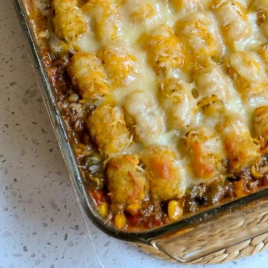 This mouthwatering good Cowboy Casserole combines tater tots, ground beef, onions, green beans, corn, tomatoes, beef gravy, and cheese into a hearty homestyle casserole. My family just loves this easy dish made with frozen tater tots and a quick made from scratch gravy.