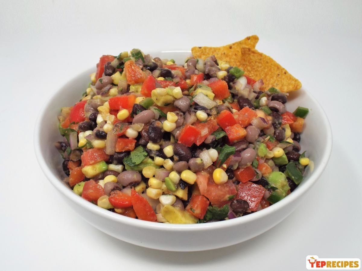 Also known as Texas Caviar this dip is made up of black eyed peas, black beans, onion, peppers, corn, and avocado then tossed with a lime vinaigrette dressing and served with tortilla chips.